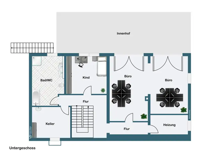 In the basement, you will find another bedroom, a bathroom with shower and bath and a separate wing with two versatile rooms. These are suitable for both living and working purposes. Both rooms have an exit to the large, secluded inner courtyard, which offers additional open space. The rooms are complemented by a boiler room and a cellar.