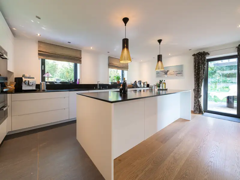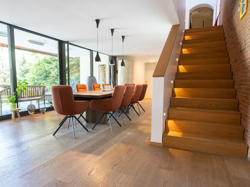 As soon as you enter the property, you will feel that this is a different way of living. Spacious rooms, light-flooded areas and many loving details characterize the picture. The central living area on the first floor invites you to get together, relax and enjoy - whether with family or guests. A cozy fireplace room, a spacious, modern eat-in kitchen with high-quality fittings and the conservatory with glass on three sides make this level the lively heart of the house. Here you can cook, laugh, celebrate - or simply enjoy nature in quiet moments.