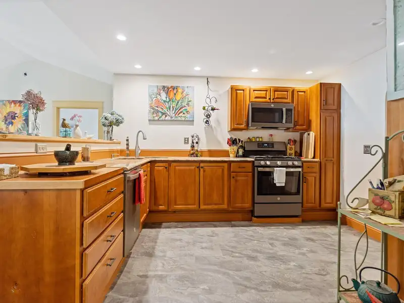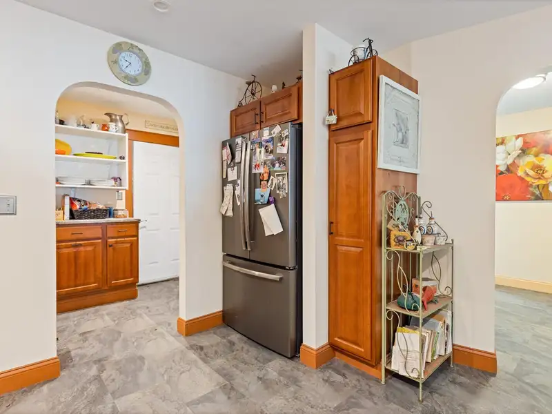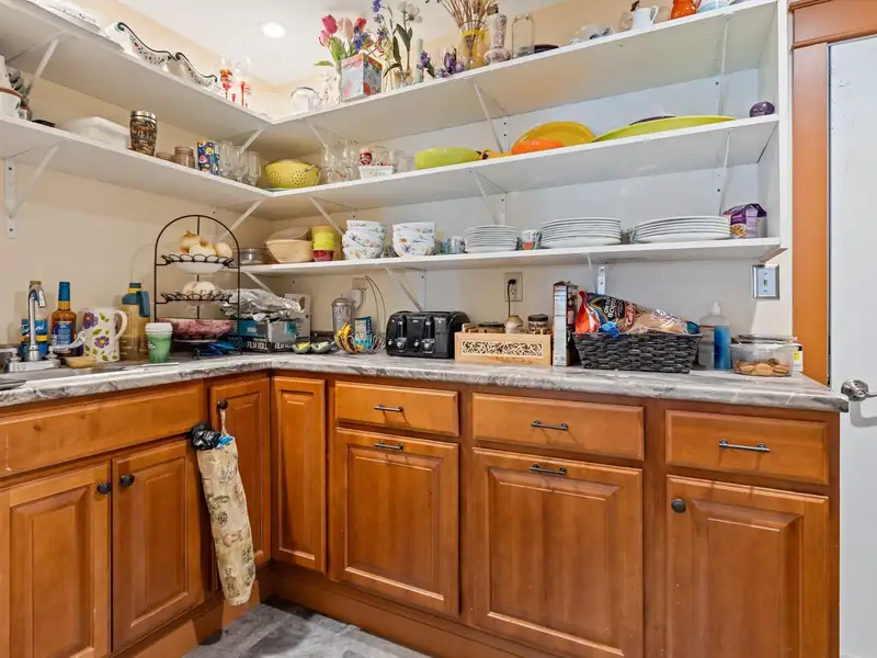 - Kitchen with granite countertops and pantry