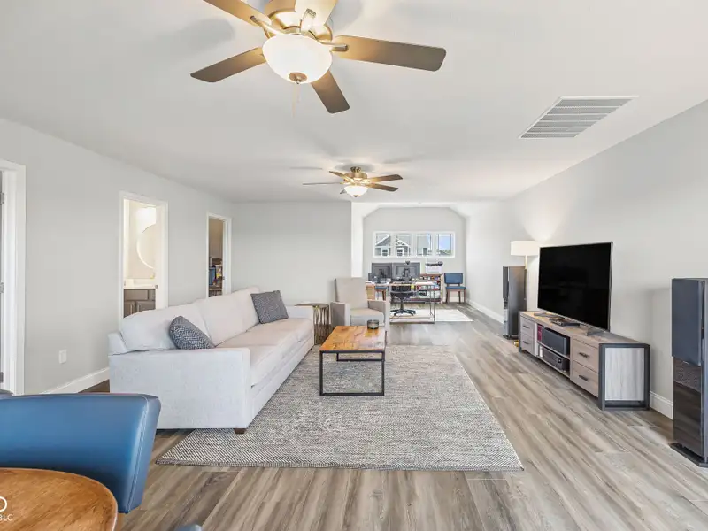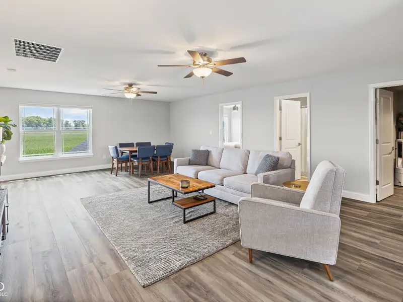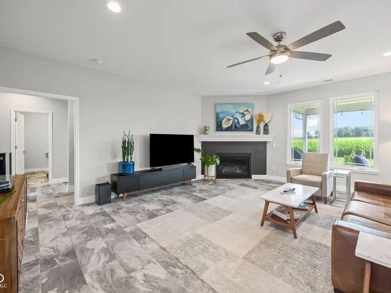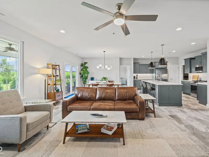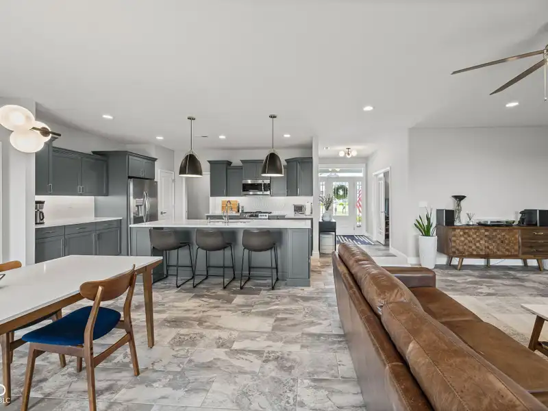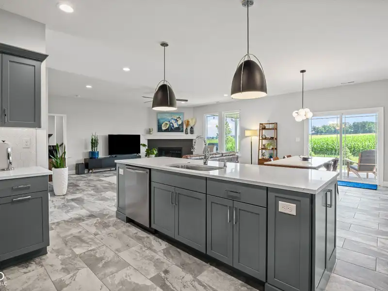 - Open floor plan with large kitchen island