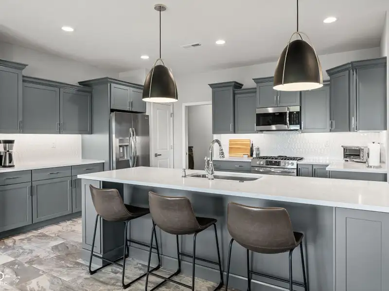 - Quartz kitchen counters with 5-burner gas range