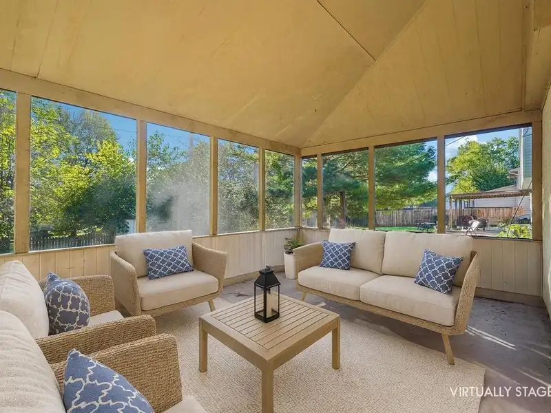 - Screened-in porch with mature trees
