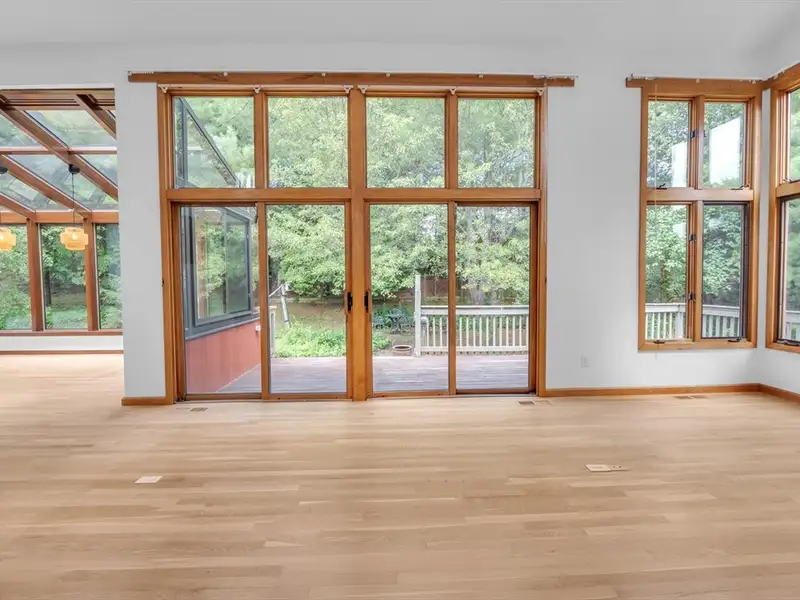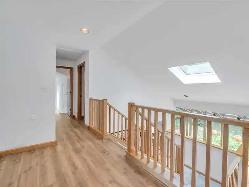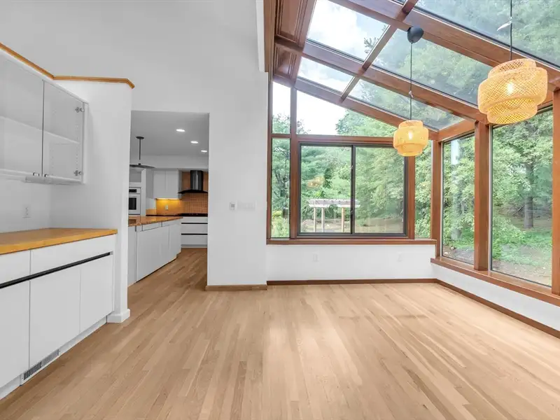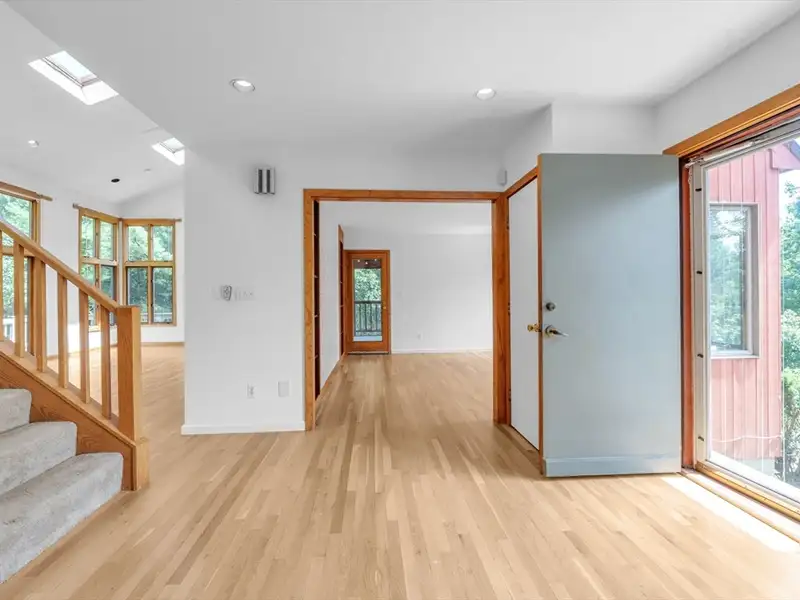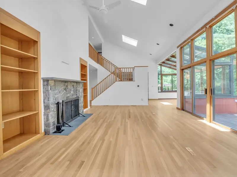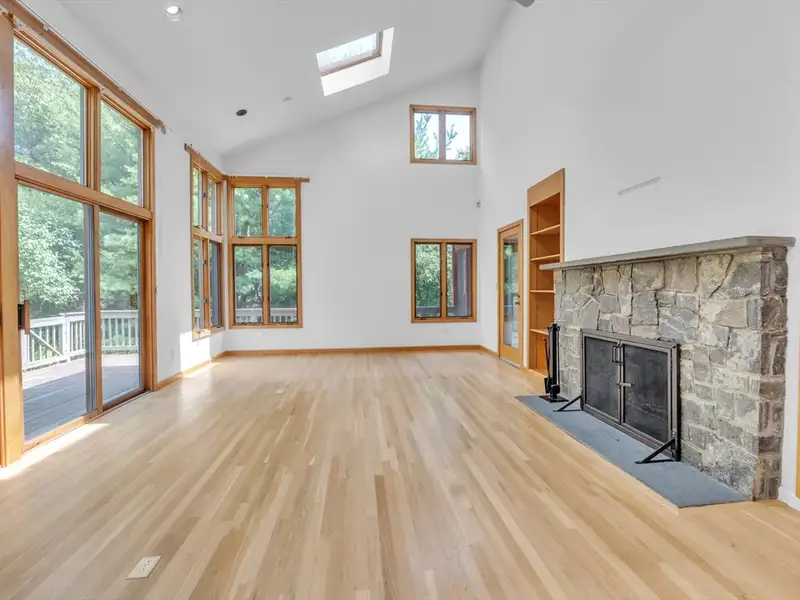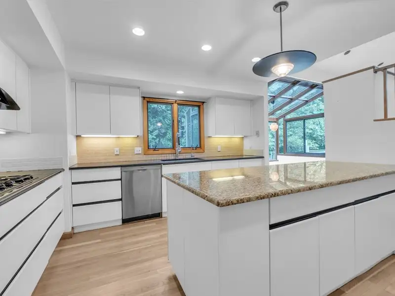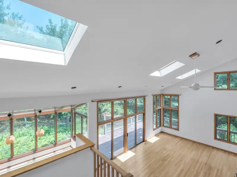 This beautifully maintained contemporary home is privately set back by a winding driveway through vibrant perennial gardens, fruit, & ornamental trees. Enjoy stunning sunset views from both the front porch and rear deck.The open-concept first floor features hardwood floors, cathedral ceilings, skylights, & a chef s kitchen with a granite island, white cabinetry, stainless appliances, 5-burner gas range, funnel vent hood, and walk-in pantry. The kitchen opens up to a new glass atrium, dining room and a spacious great room with built-ins, oversized windows, and a granite fireplace with bluestone mantel. First floor also includes an office/living room, half bath, and laundry. Upstairs, the ensuite primary bedroom offers a large tiled bath and walk-in closet. Two additional bedrooms & a full bath complete the second floor. This exceptional home blends elegance & functionality in a truly tranquil setting-perfect for those who appreciate natural beauty, privacy, & architectural distinction.