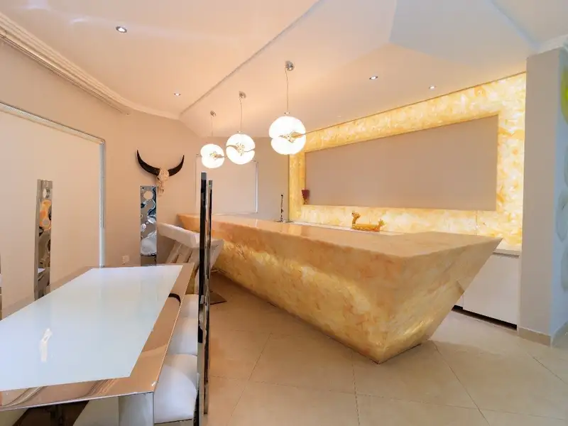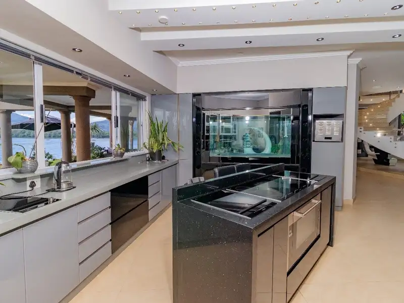 Interior Highlights: Top of the line chef’s kitchen, Seamless combined aquarium screening, the kitchen from the main lounge, Home office, Cinema room, Study, Pantry, Guest toilet, Entrance hall, Under floor heating