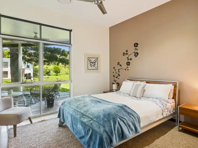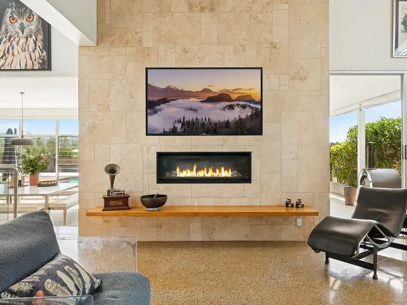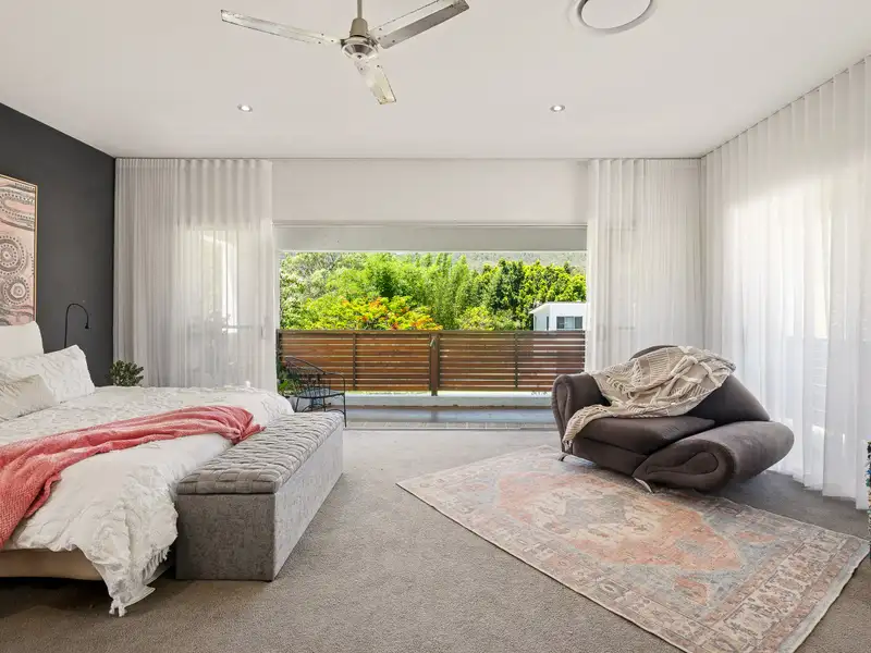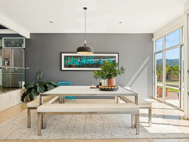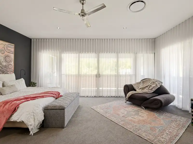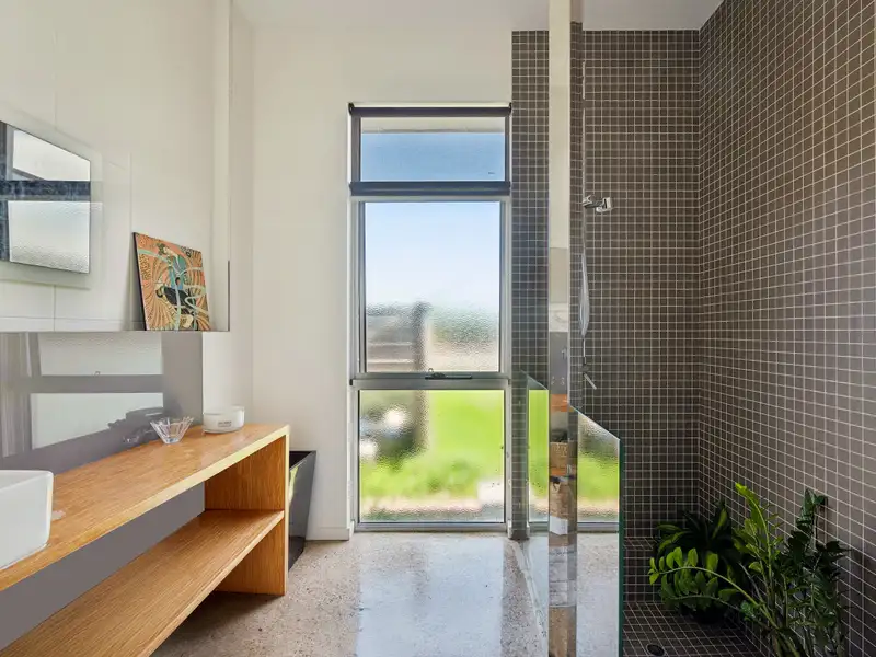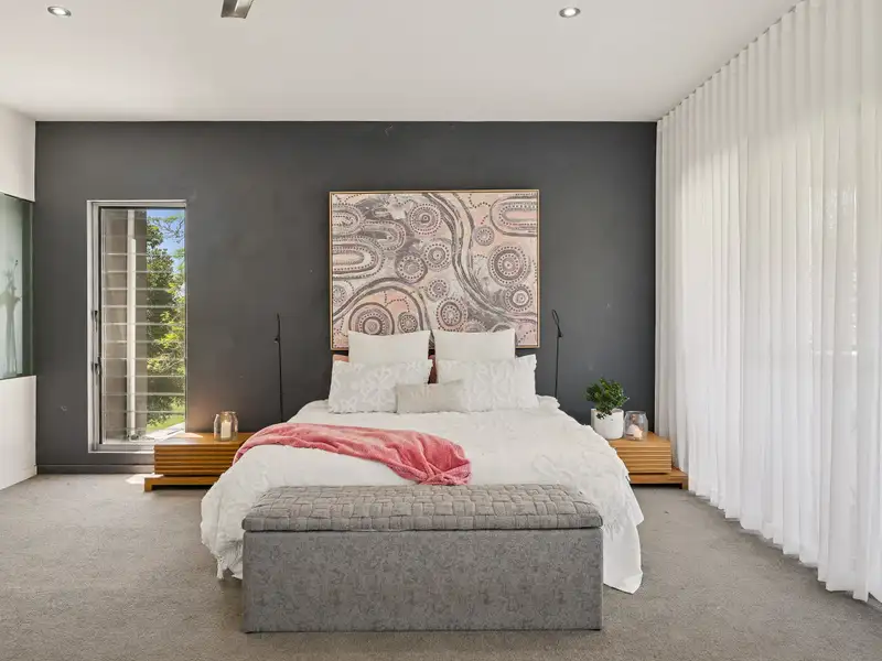Every element of the interior has been curated with style and purpose. Polished concrete floors anchor the main living areas with sleek modern appeal, while soft carpets in the bedrooms create cosy retreats. Rich Daintree hickory timber flooring adds timeless elegance, enhanced by soaring ceilings and full-length windows that flood the home with natural light and frame the stunning surrounds.