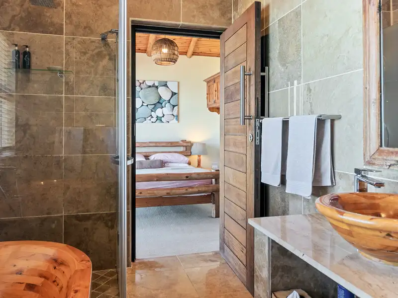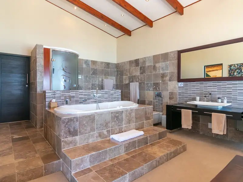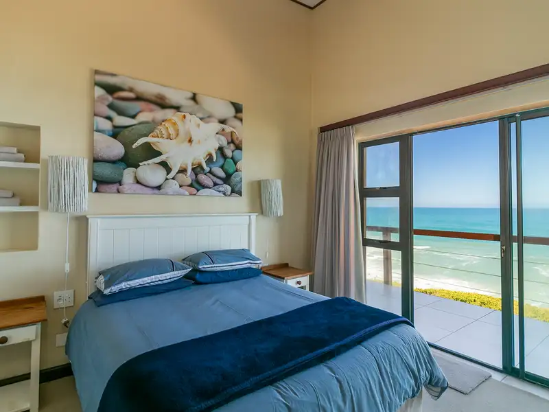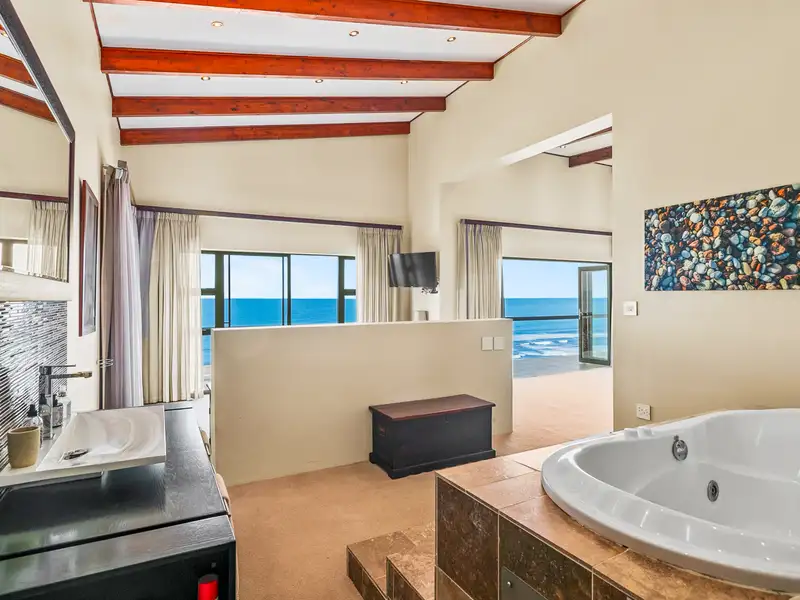 On the upper level, the master suite serves as a private retreat, offering awe-inspiring ocean views that can be savoured from the comfort of your bed. The master bedroom is complete with a luxurious en-suite bathroom, ample built-in cupboard space, and a cozy lounge area that opens onto a private balcony—perfect for morning coffees or sunset reflections.
