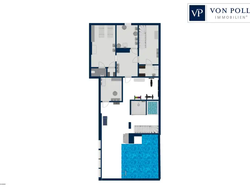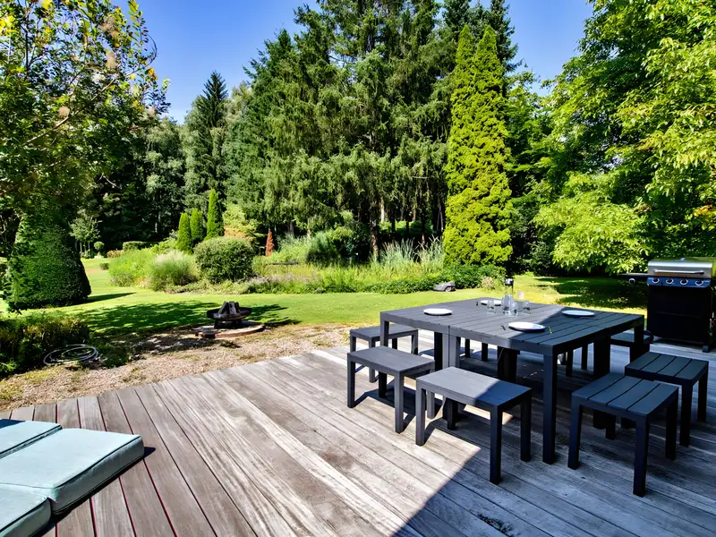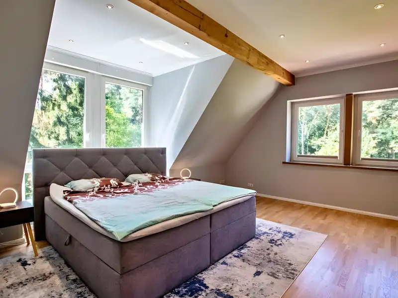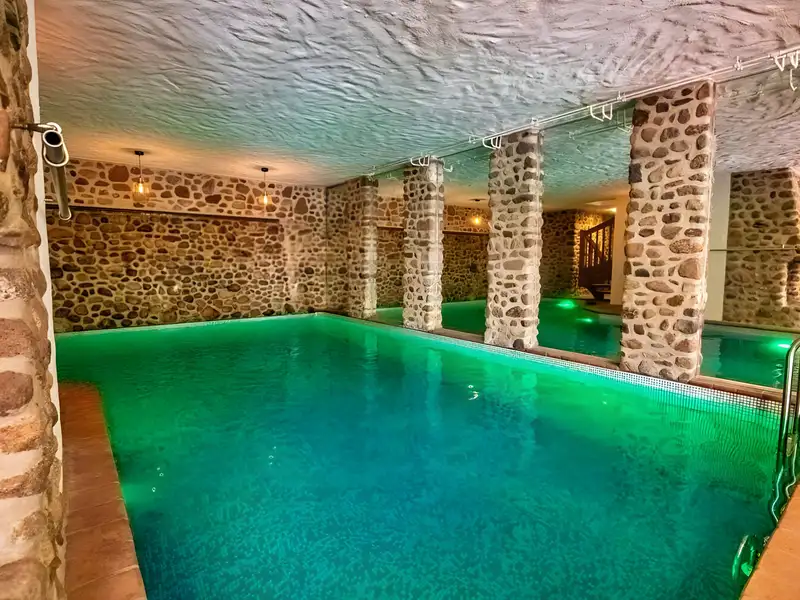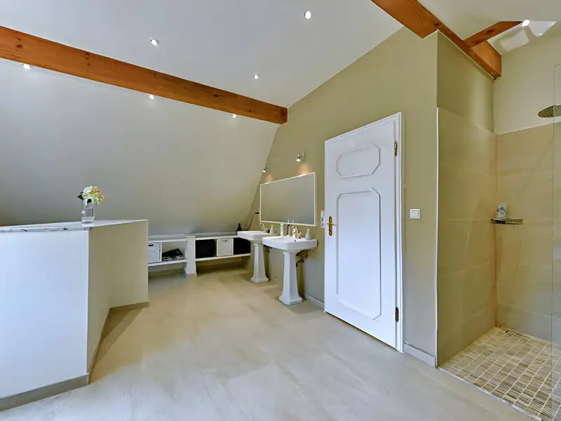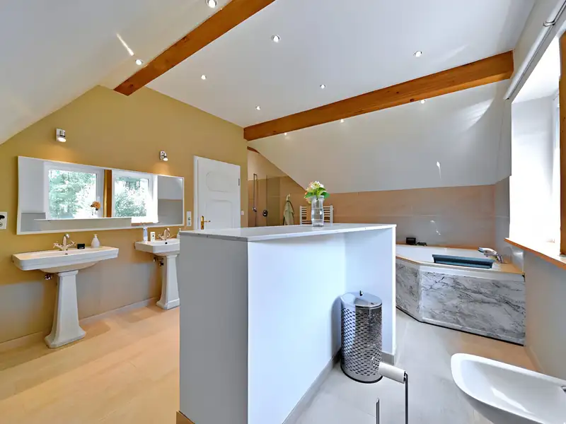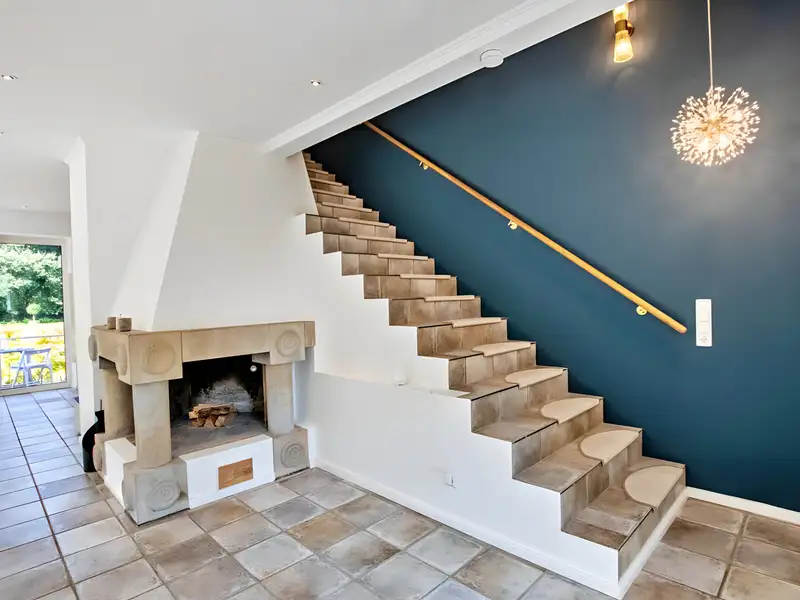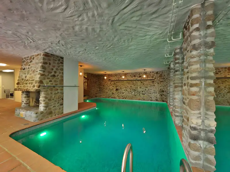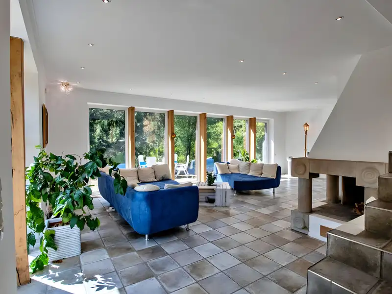 The private wellness area of the house is particularly noteworthy. A spacious swimming pool with waterfall and cold pool awaits you here. An open fireplace also creates a special atmosphere here. The wellness area is ideal for relaxing and unwinding after a long day.