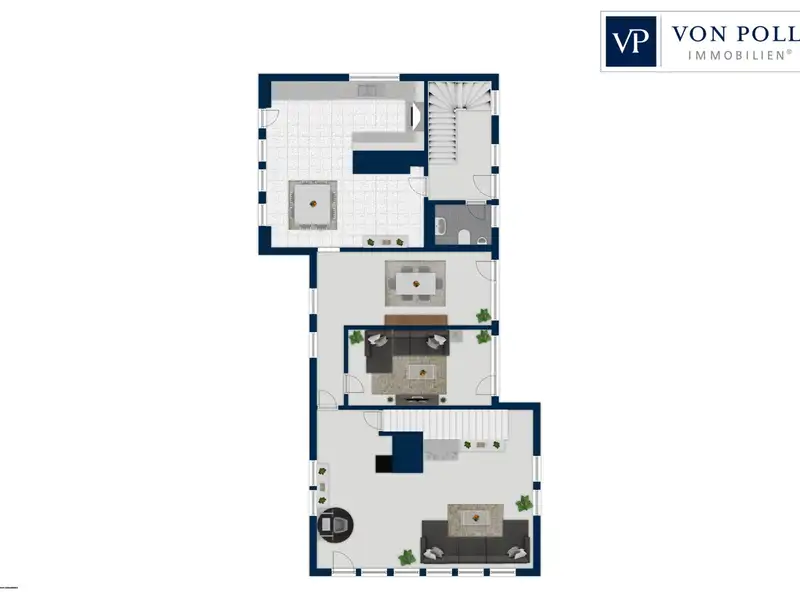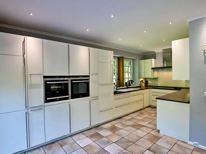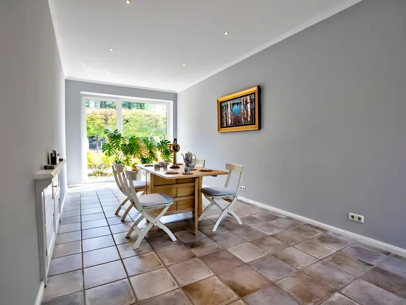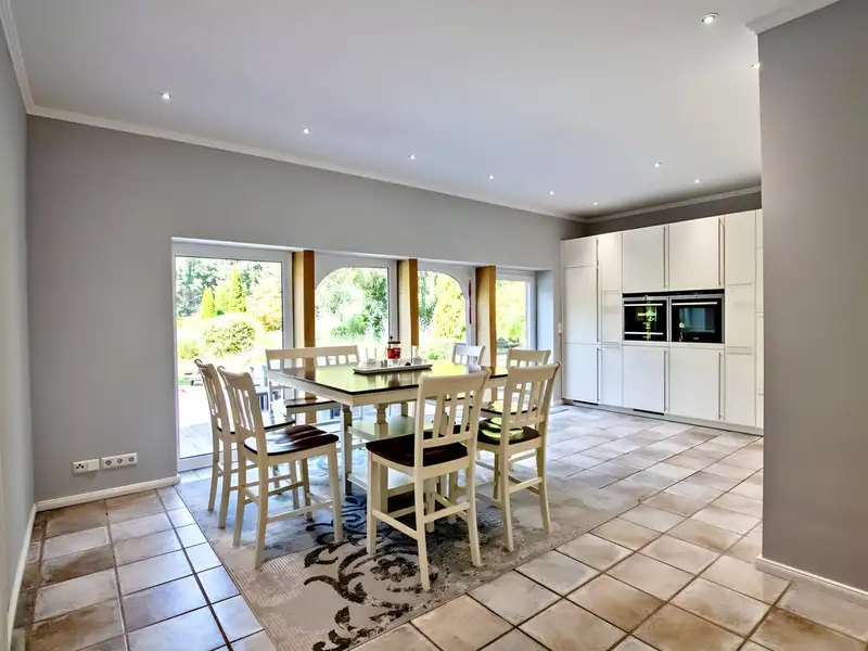 The open-plan kitchen with high-quality, integrated electrical appliances has a timeless design. The kitchen area offers plenty of space for cooking and eating. The adjoining dining room is ideal for formal occasions.