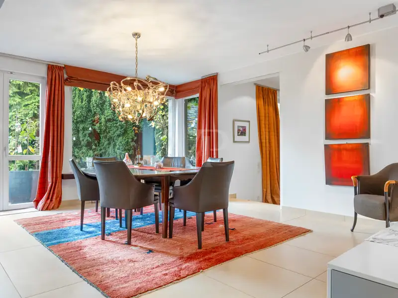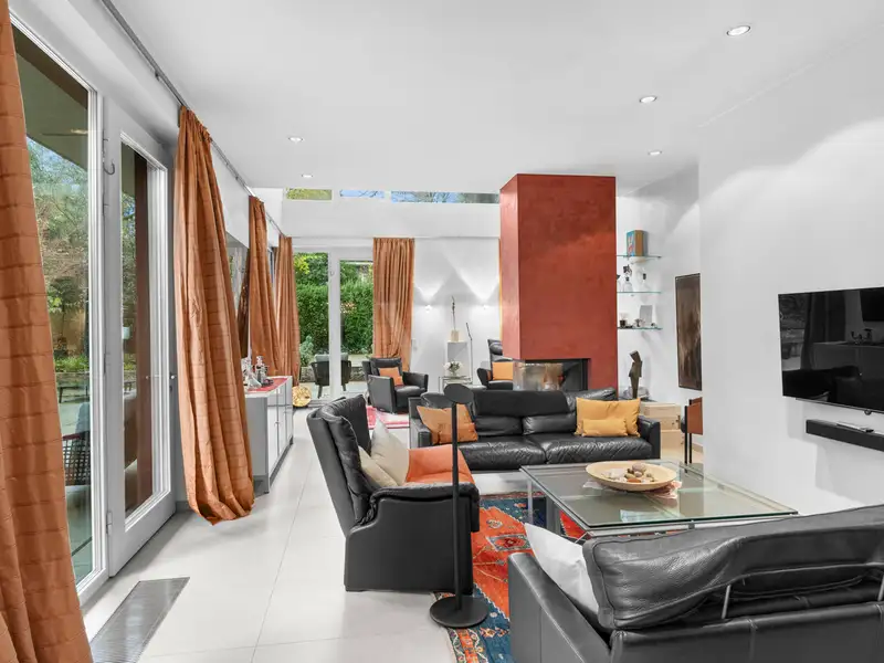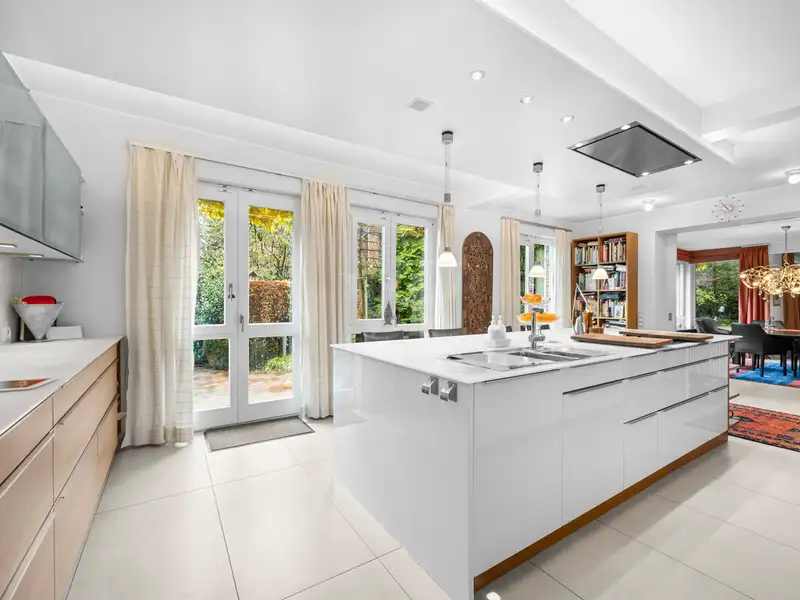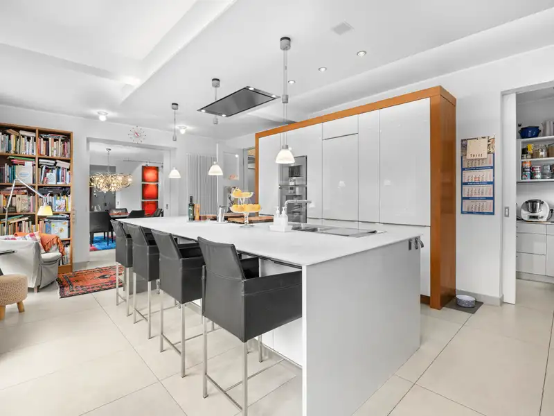 The heart of this home is the spacious living room, which impresses with its light-flooded atmosphere. There is plenty of space for relaxation and sociable evenings here. The adjoining kitchen is functionally designed and offers plenty of space for culinary activities. There is also a scullery adjacent to the kitchen, which offers plenty of space thanks to its bespoke built-in cupboards.