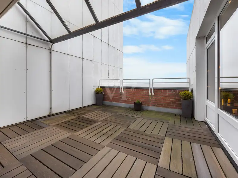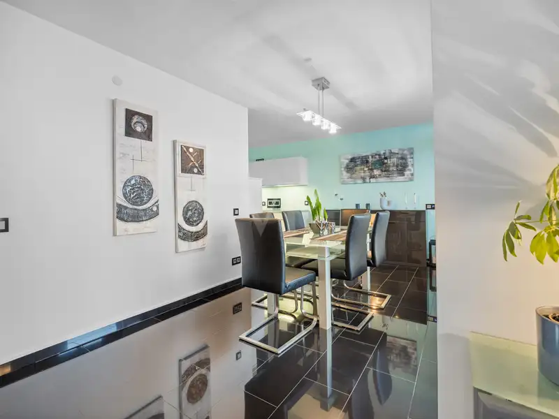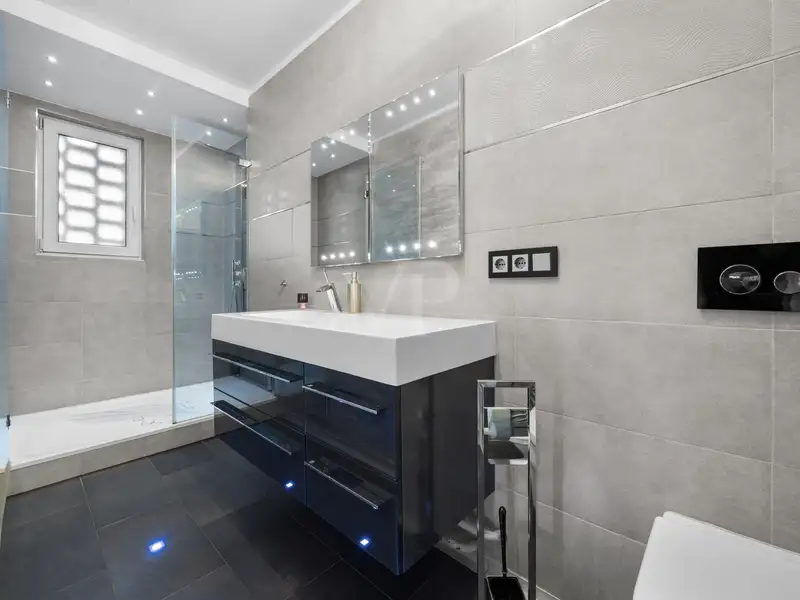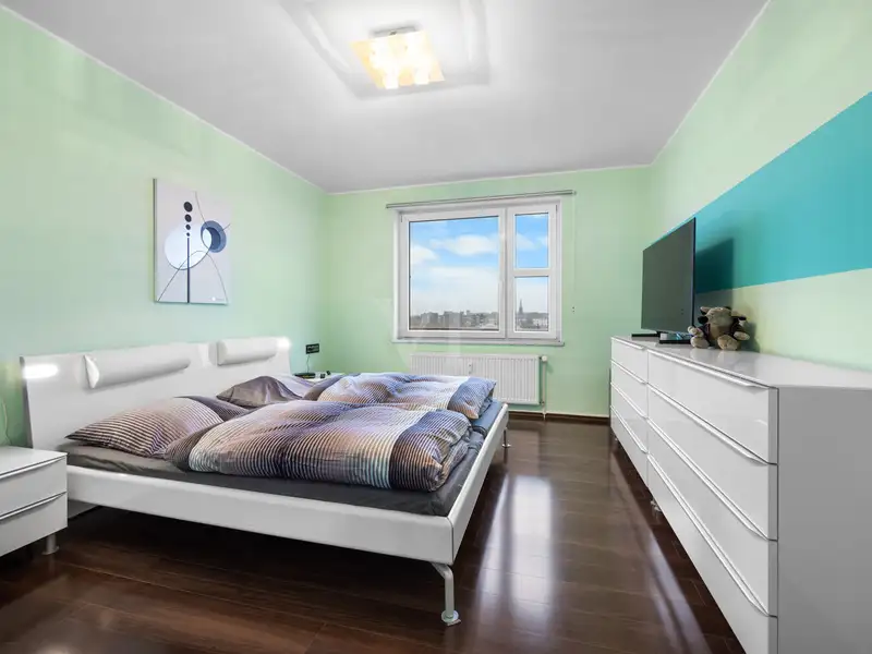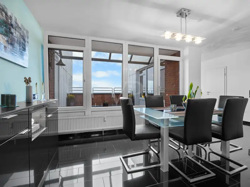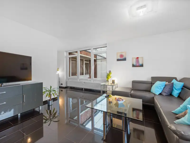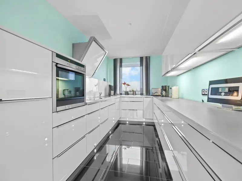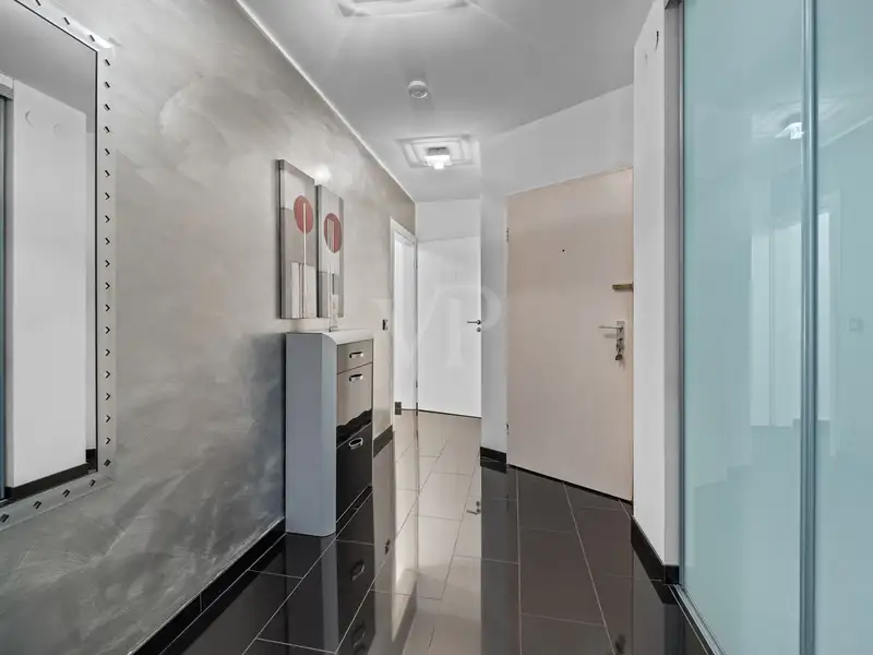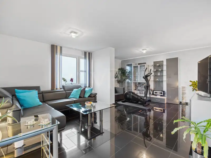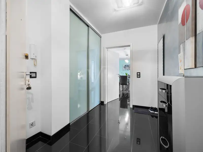 The entire apartment impresses with large windows that let in plenty of light and smooth walls that create an elegant overall look. Laminate flooring has been laid in the bedroom, creating a harmonious contrast to the high-quality tiles in the other living areas and bathrooms. The high-quality, open-plan fitted kitchen is equipped with modern electrical appliances and has LED skirting boards that create a pleasant ambience. There is also an integrated wall-mounted radio in the kitchen, which makes cooking and entertaining even more enjoyable. In the hallway, a custom-made built-in wardrobe has been created as a coat rack, guaranteeing both functionality and order. The main bathroom and the guest WC are equipped with high-quality fittings, modern sanitary facilities and attractive tiles. The windows are also of very high quality and guarantee optimum sound and heat insulation.