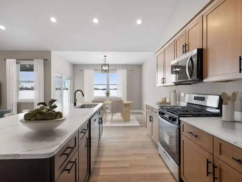 - Kitchen with stone countertops and stainless appliances