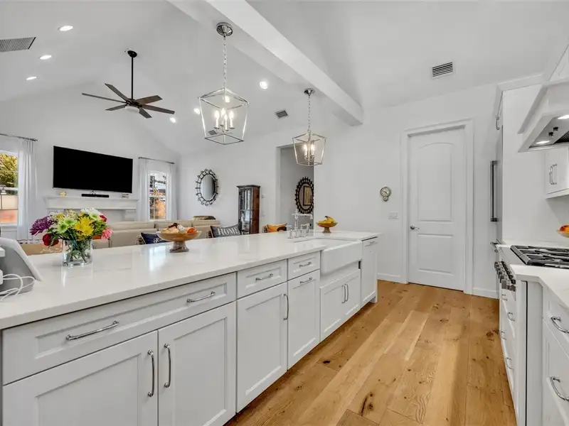 The chef-inspired kitchen is the heart of the home, featuring an abundance of custom solid-wood cabinets, gleaming quartz countertops, and a large island with seating for four. A generous walk-in pantry with custom shelving and top-of-the-line Thermador stainless steel appliances—including a 6-burner gas stove, double oven, and deep farm sink—make meal preparation and entertaining effortless. Adjacent to the kitchen, a charming dining area is perfect for memorable dinners, while the adjoining family room boasts a soaring cathedral ceiling, a natural gas fireplace with a custom stone mantel, and large windows that flood the space with natural light.