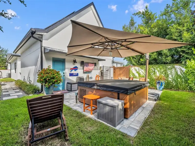 Outside, enjoy a private backyard oasis designed for relaxation and entertainment. Highlights include a “Michael Phelps Chilly Goat” hot/cold tub combo, outdoor TV, and speakers—creating your personal weekend paradise.