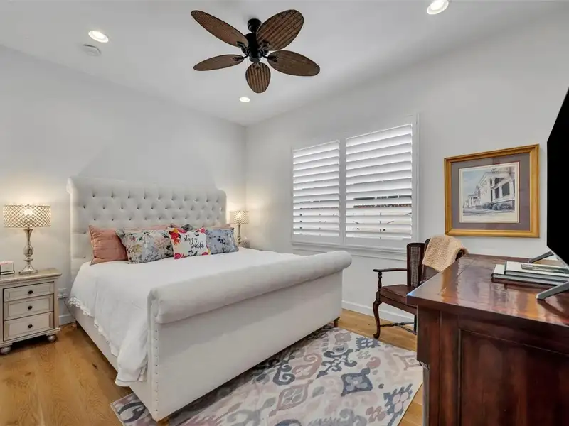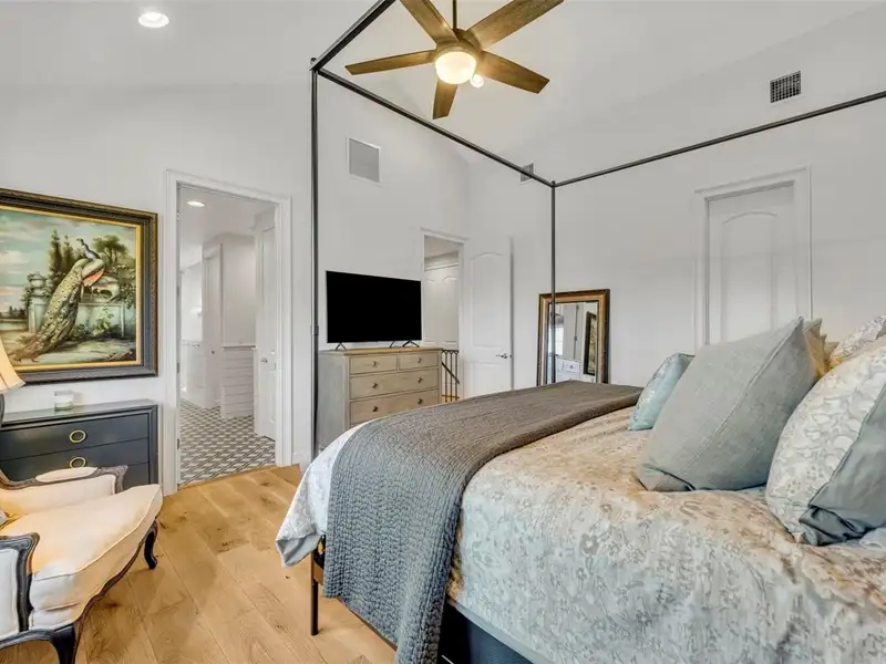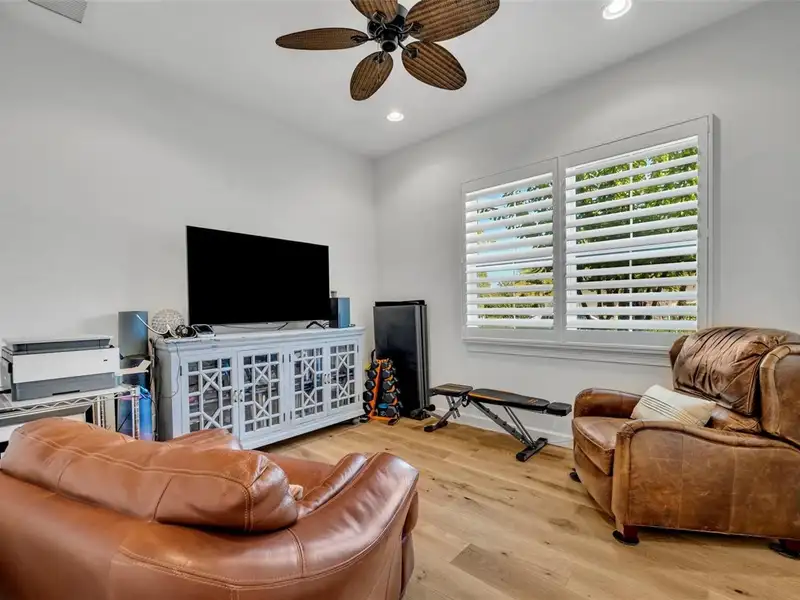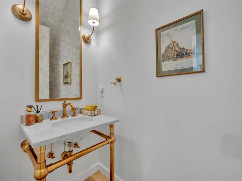 Upstairs, the luxurious primary suite features a spa-inspired bathroom with double sinks, custom Restoration Hardware cabinetry, elegant lighting, and a large walk-in shower. A peaceful sitting area and a walk-in closet with custom shelving create a perfect private retreat. Additionally, an upstairs loft offers versatile space ideal for a home office, gym, or additional quiet area.
