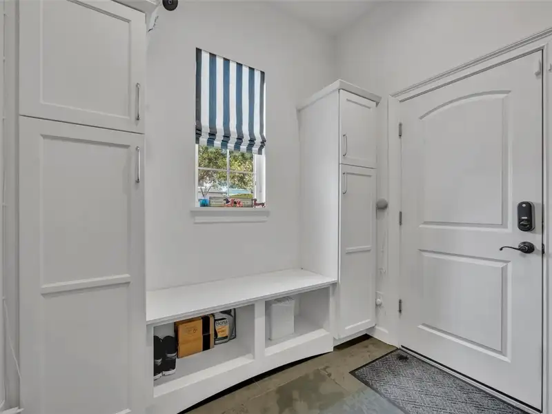A cozy private den offers an ideal retreat for work or relaxation. On the opposite side of the first floor, you'll find a guest suite with a private bath, two additional bedrooms with custom closets, a stylish full bath, and a laundry room with ample storage and a utility sink. The spacious mudroom, accessible from the two-car garage, provides practical storage with built-in cabinets and hooks.