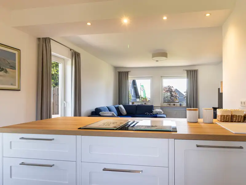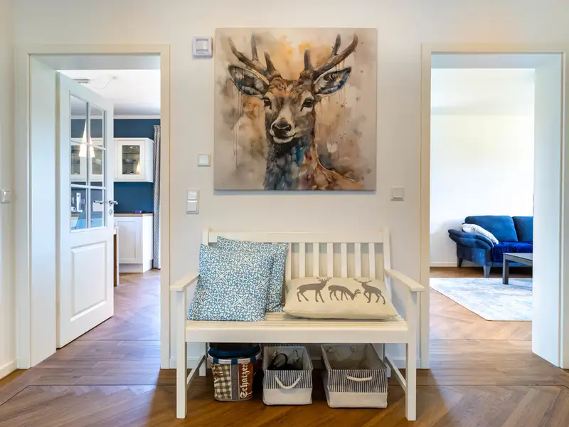 The kitchen is also designed in a country house style and features white fronts and warm wooden accents that perfectly match the floor. This combination creates a timeless, cozy ambience that combines traditional charm with modern functionality. The high-quality fitted kitchen is equipped with modern appliances and offers optimal conditions for culinary experiences.