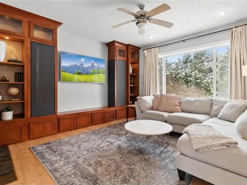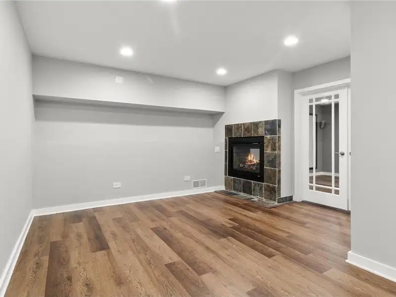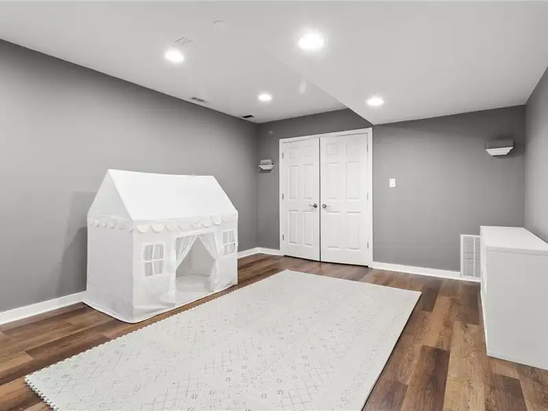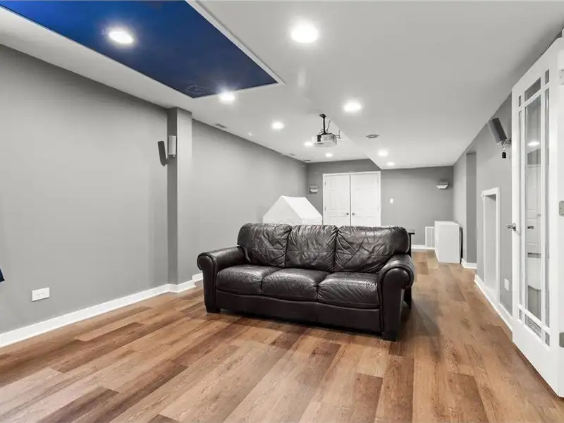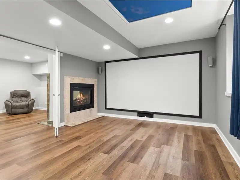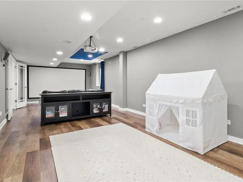 - Lower-level media room with projector screen
