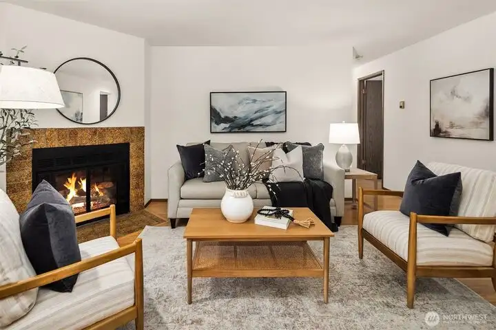 - Wood-burning fireplace in living room