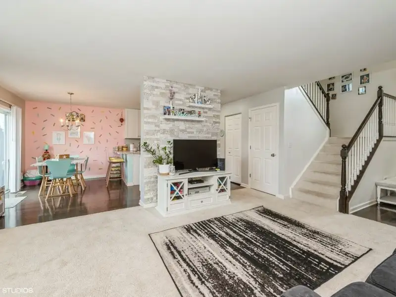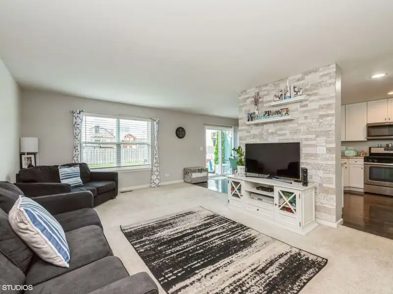 - Open-concept living room with brick accent