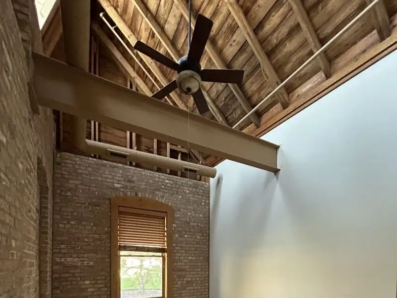 - Dramatic vaulted ceilings with timber beams