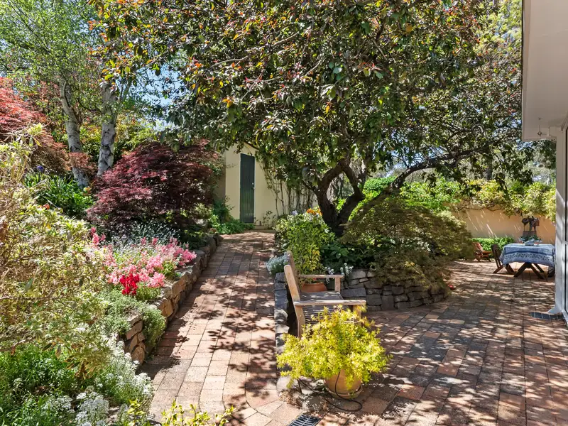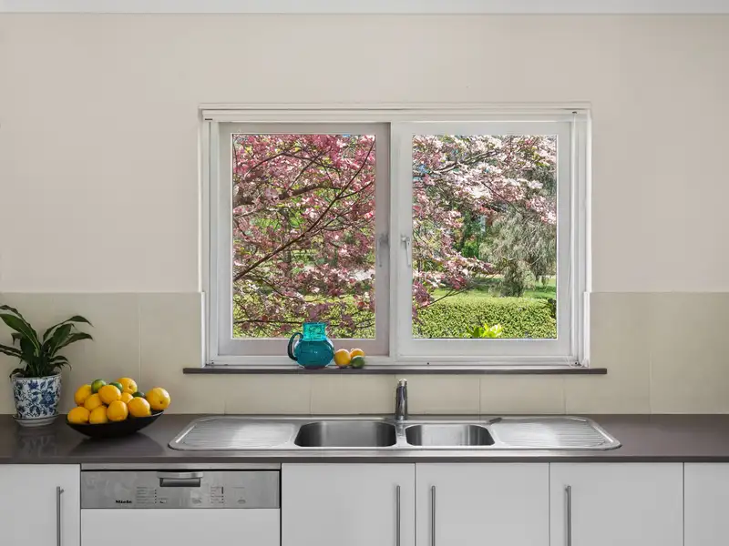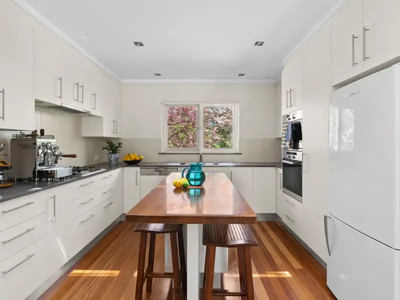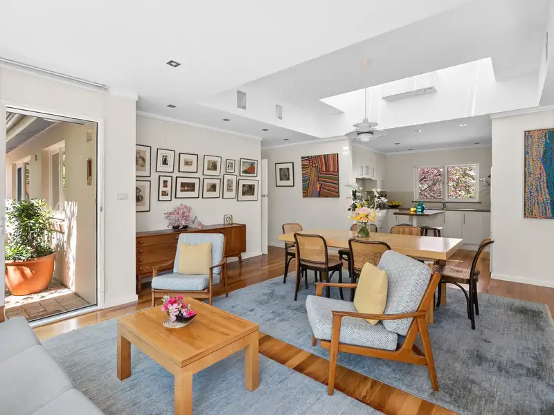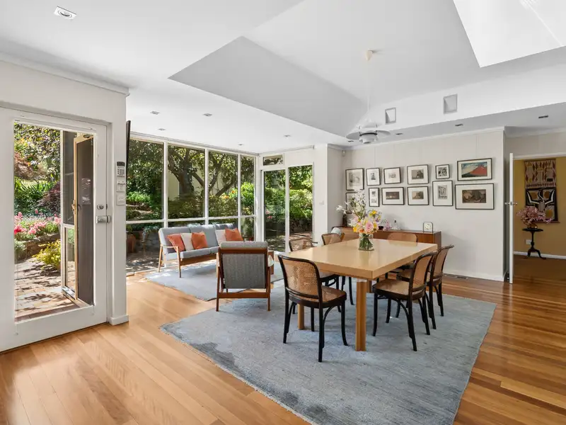 Exuding warmth, light, and architectural charm, this beautifully updated home offers a flexible floorplan with a wonderful selection of living and entertaining spaces. The elegant formal lounge, complete with an open fireplace, large picture windows, and seamless access to a dapple-shaded terrace, provides the perfect setting for relaxing or hosting guests. At the heart of the home, striking vaulted ceilings, skylights, and rich timber floors combine to create a sense of space and sophistication, all enhanced by abundant natural light and tranquil views over the established gardens.