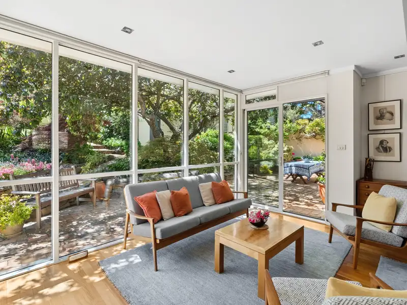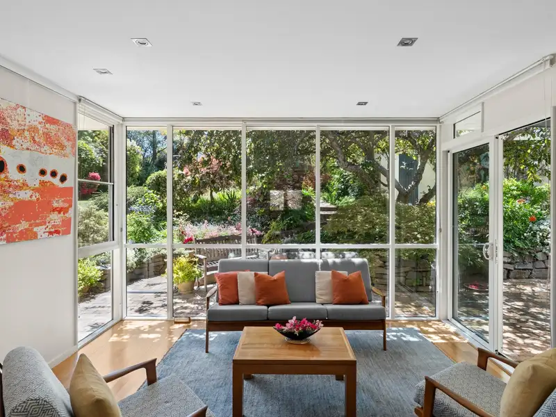 A seamless blend of timeless mid-century character and contemporary design offering sun-drenched living spaces with floor-to-ceiling windows that frame lush, colourful gardens within a tranquil and light-filled sanctuary.