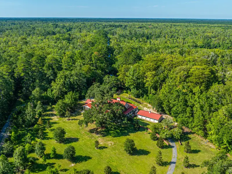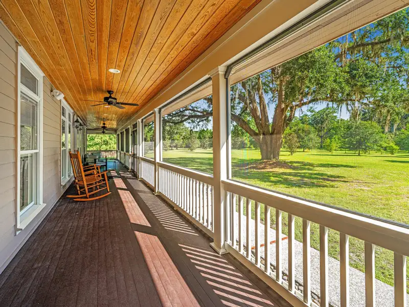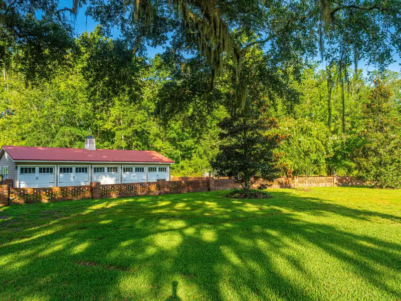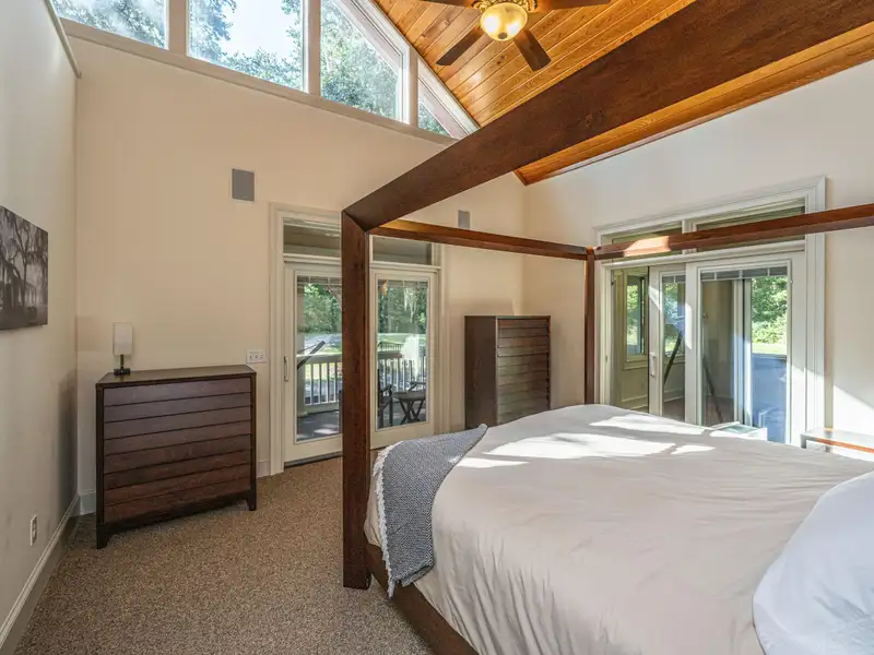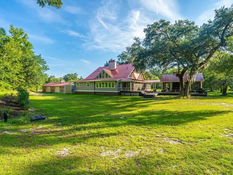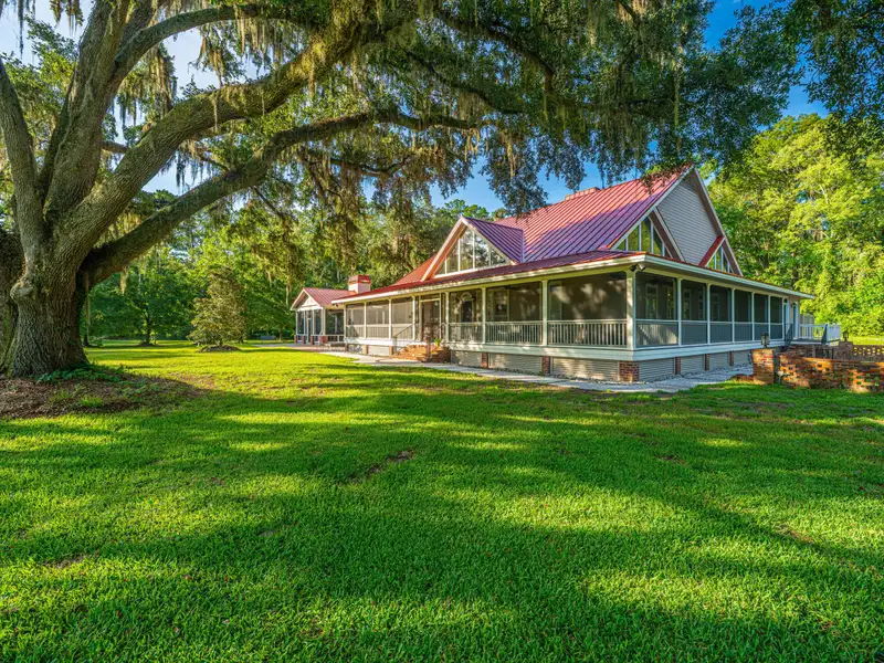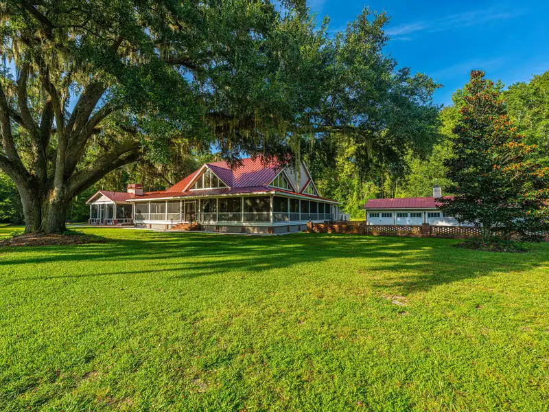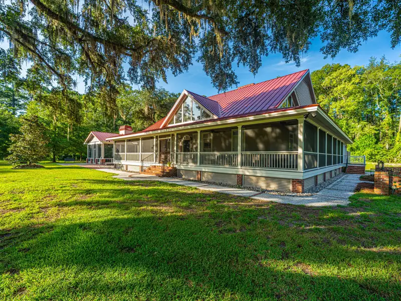 carriage house and irrigation from the nearby well. The house Main was designed as one of the last projects of Doug Corken, a well-known Lowcountry architect. A wide screened porch with burnt poplar screen doors keeps the porch nearly bug free while you sip your mint julep under the cool breeze of the numerous overhead paddle fans. The cypress ceilings on the porch ceiling add to the aesthetics. The exterior of the house has six large trapezoidal windows. One window for each of the vaulted ceilings in the four bedrooms, and two windows at each end of the main living room with its massive fireplace. The Carolina room in the main house faces the canal. The full length of the Carolina room is covered with windows for unobstructed view of wildlife and the canal. It was completed in approximately 2015 at the time the screened cook shed is was built . The screened cook shed is great for entertaining and is approximately 1,000 Sq Ft. under roof. The deck behind the guest house's main bedroom was replaced in 2025, and wooden hand railing on the deck and steps were replaced with durable black metal. A chimney lies just outside of the guest house which would make a great spot for an outdoor fireplace. Approximately 1 hour to Charleston or Savannah, 30 minutes to Beaufort. 45 minutes to Hilton Head.