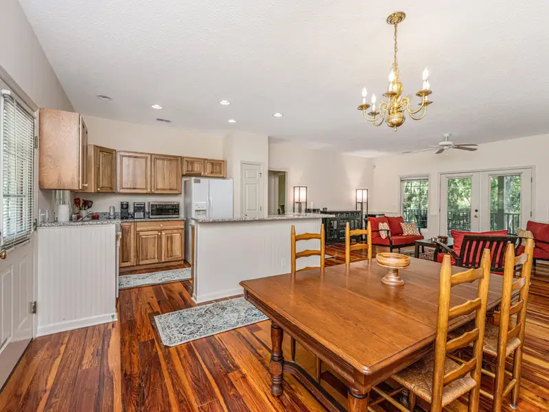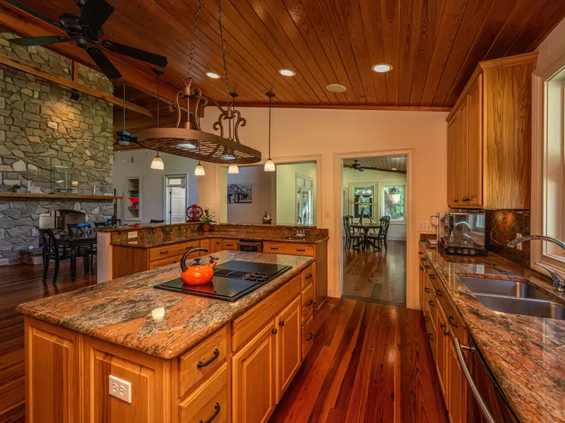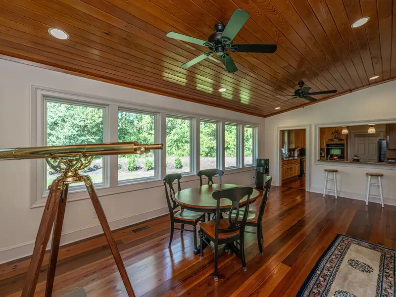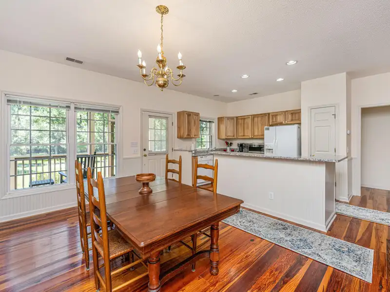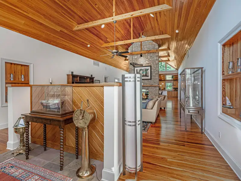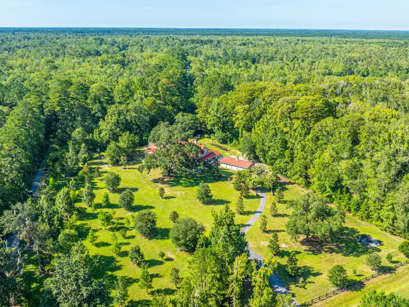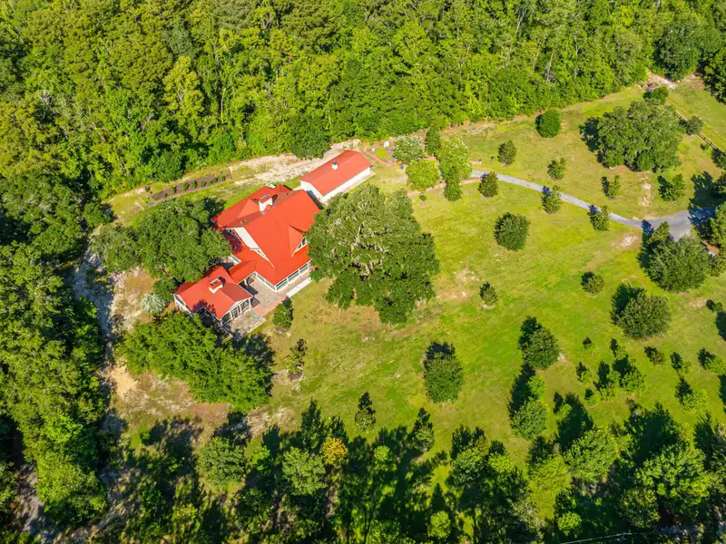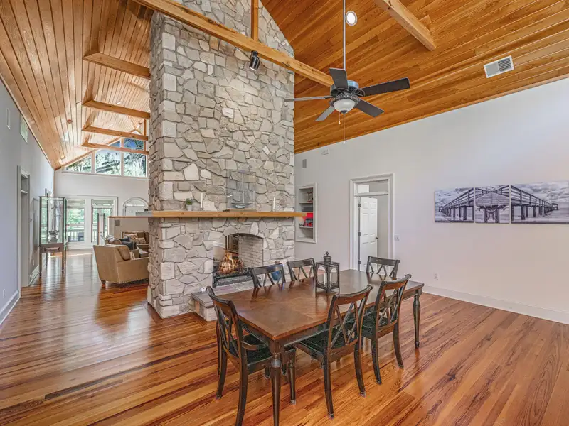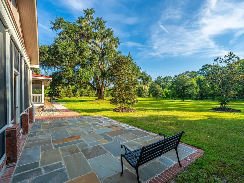carriage house and irrigation from the nearby well. The house Main was designed as one of the last projects of Doug Corken, a well-known Lowcountry architect. A wide screened porch with burnt poplar screen doors keeps the porch nearly bug free while you sip your mint julep under the cool breeze of the numerous overhead paddle fans. The cypress ceilings on the porch ceiling add to the aesthetics. The exterior of the house has six large trapezoidal windows. One window for each of the vaulted ceilings in the four bedrooms, and two windows at each end of the main living room with its massive fireplace. The Carolina room in the main house faces the canal. The full length of the Carolina room is covered with windows for unobstructed view of wildlife and the canal. It was completed in approximately 2015 at the time the screened cook shed is was built . The screened cook shed is great for entertaining and is approximately 1,000 Sq Ft. under roof. The deck behind the guest house's main bedroom was replaced in 2025, and wooden hand railing on the deck and steps were replaced with durable black metal. A chimney lies just outside of the guest house which would make a great spot for an outdoor fireplace. Approximately 1 hour to Charleston or Savannah, 30 minutes to Beaufort. 45 minutes to Hilton Head.