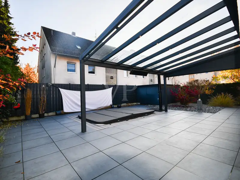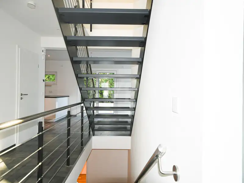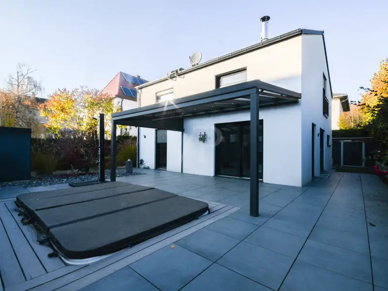 Even from the outside, the house impresses with its solid architecture. Inside, you will find an open-plan concept that impresses with its intelligent layout. On the first floor, there is a spacious living and dining area with direct access to the high-quality, covered south-facing terrace. Here you can enjoy many relaxing hours outdoors thanks to the electronically controlled sunshade and also have direct access to the outdoor swim spa whirlpool with counter-current system - a special highlight for any fitness and wellness program.