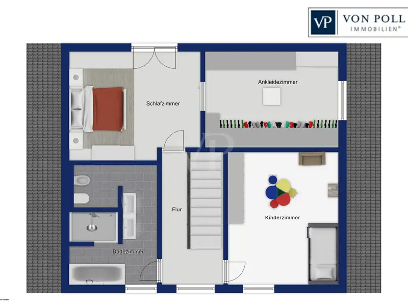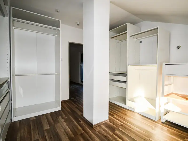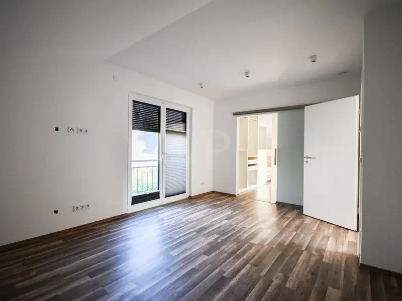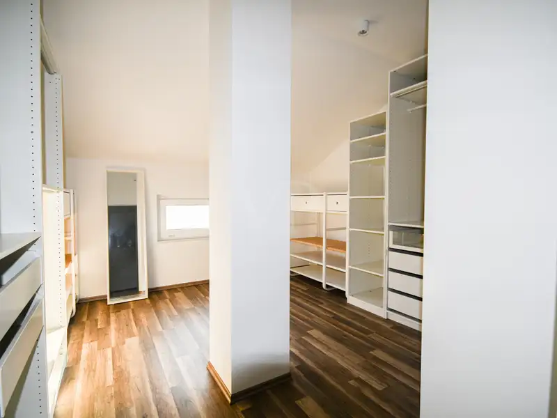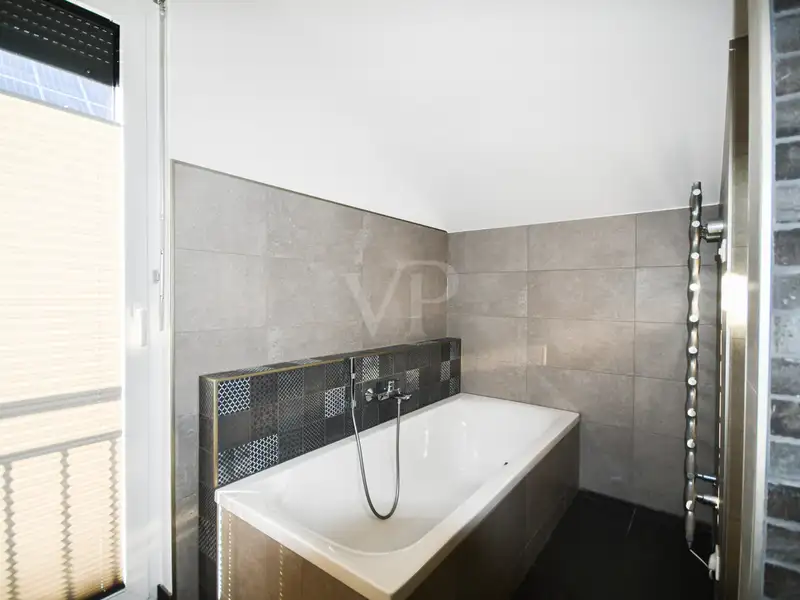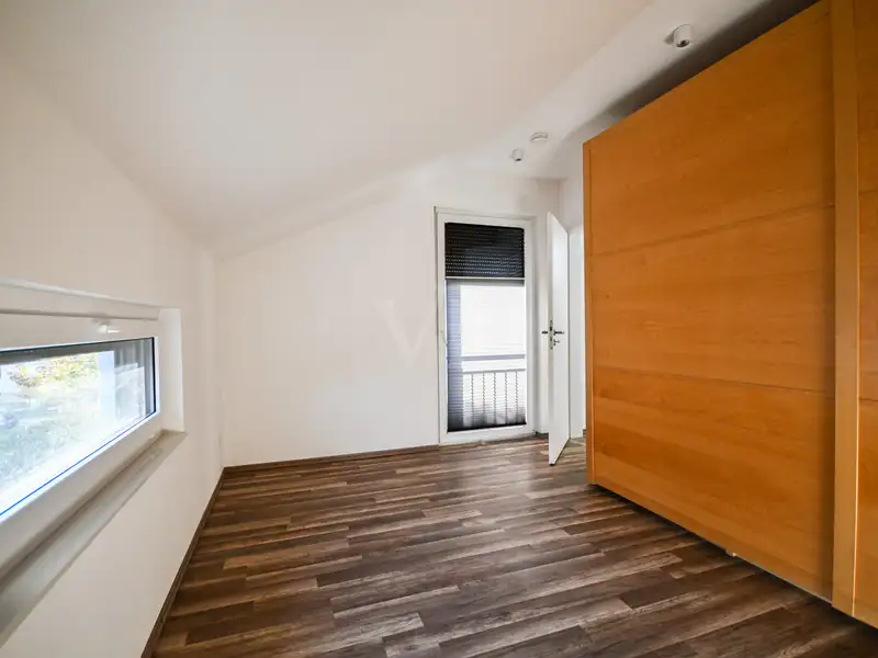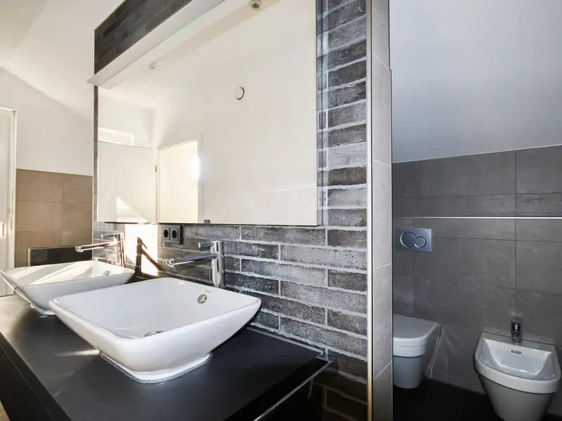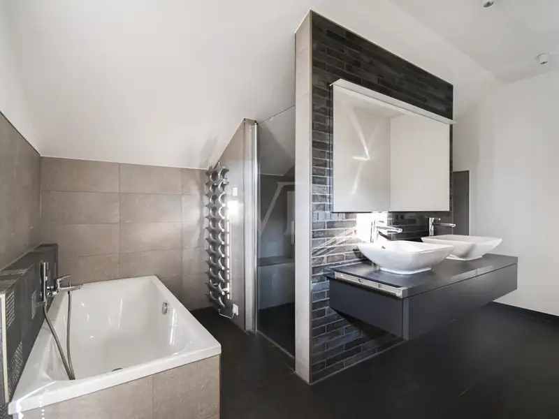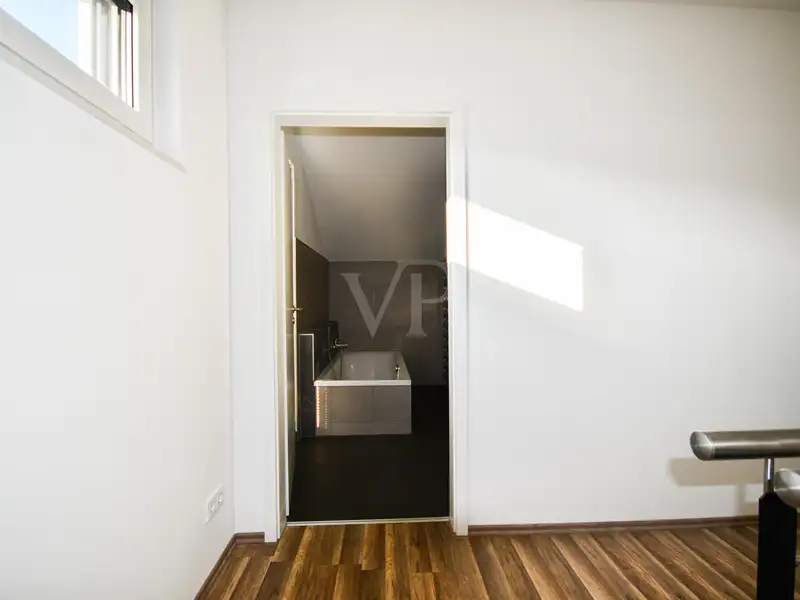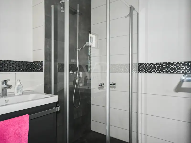 There are two spacious bedrooms on the upper floor, which can be used flexibly as children's rooms, study rooms or guest rooms. The bathroom on the upper floor is equipped with a window, a WC, a floor-level shower, a bathtub and a double washbasin, offering maximum comfort for everyday life. Thanks to the ceiling heating on the ground and upper floors, there is always a pleasant indoor climate, which is supported by the high-quality floor coverings and gives the home a warm atmosphere.