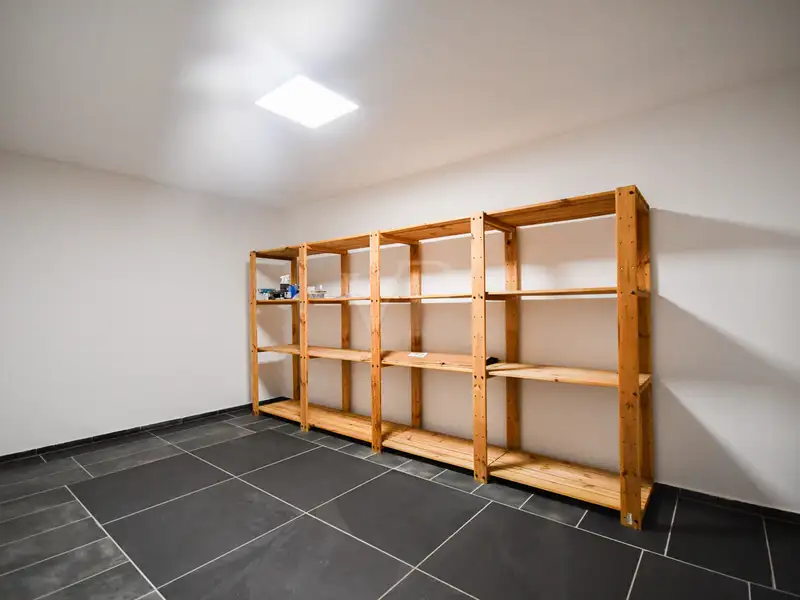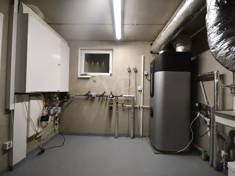 The KfW 40 efficiency house has a full basement. The heated and converted basement offers additional living or storage space. An economical air heat pump in combination with modern insulation technology ("Thermo-Wall") ensures economical and sustainable heating. Plastic insulating glass windows with electric blinds guarantee the best energy efficiency, security and comfort. The "Loxone" smart home system enables central control of heating, lighting, blinds and other home technology components via app or switch.