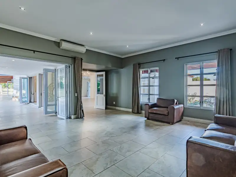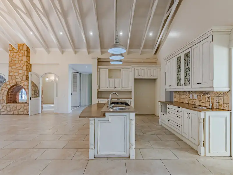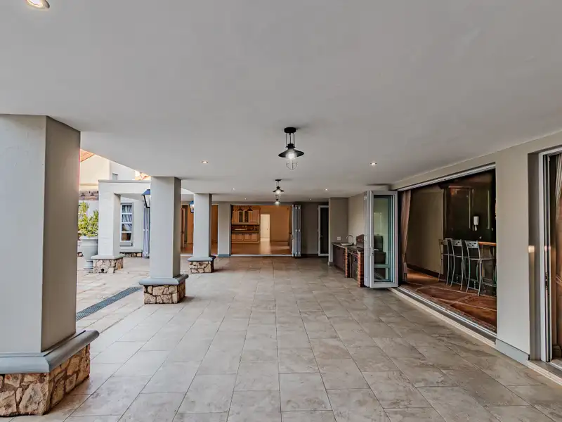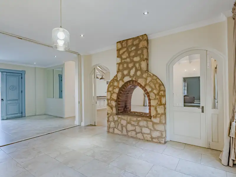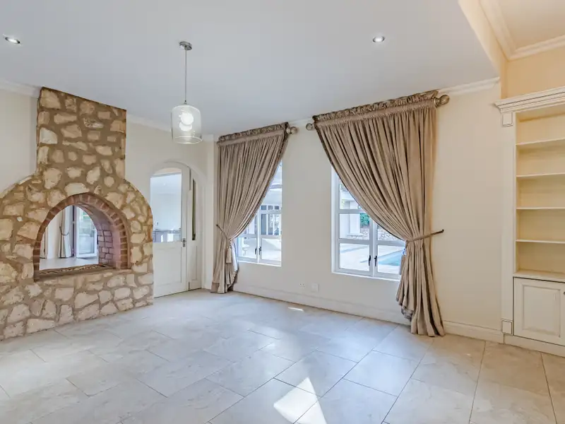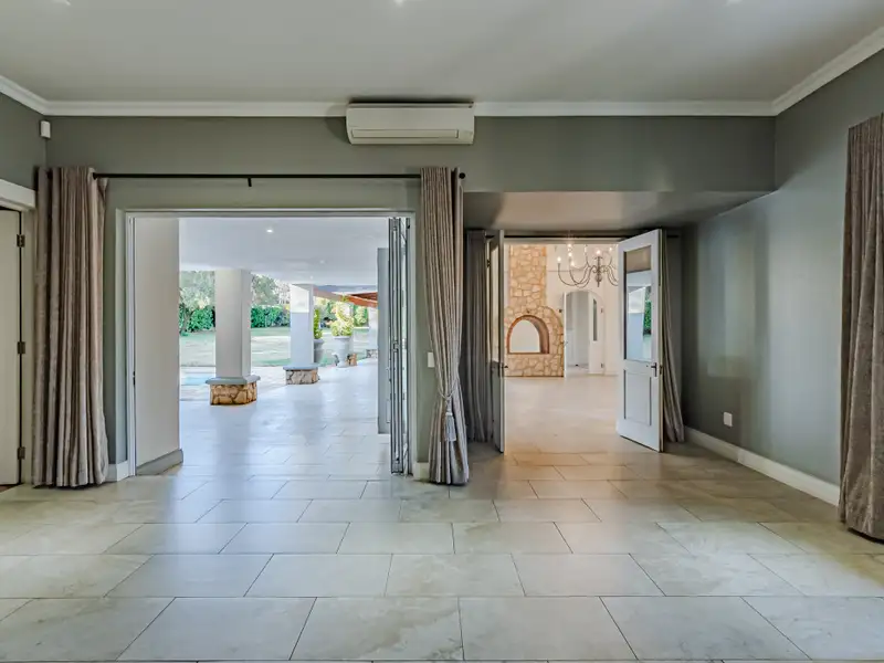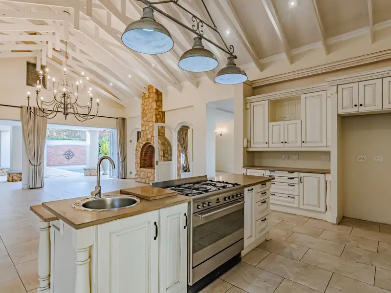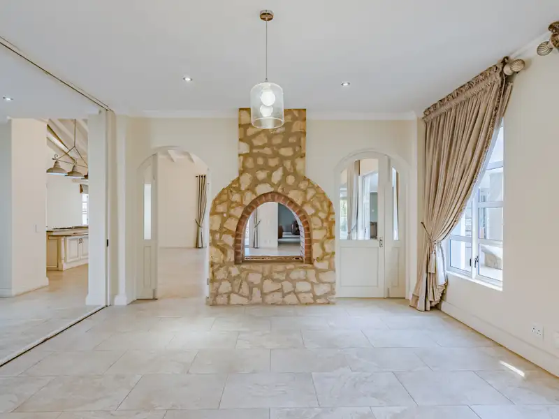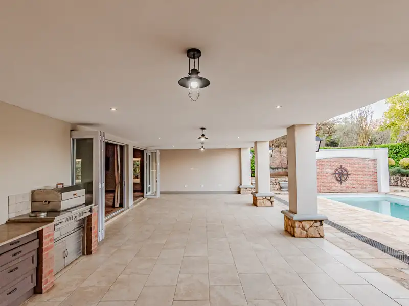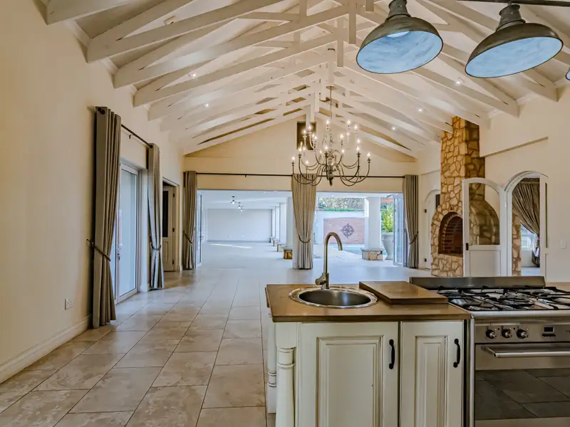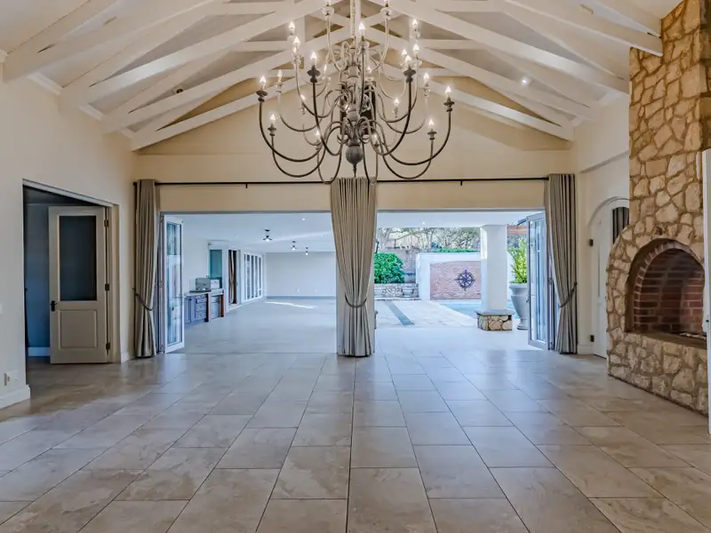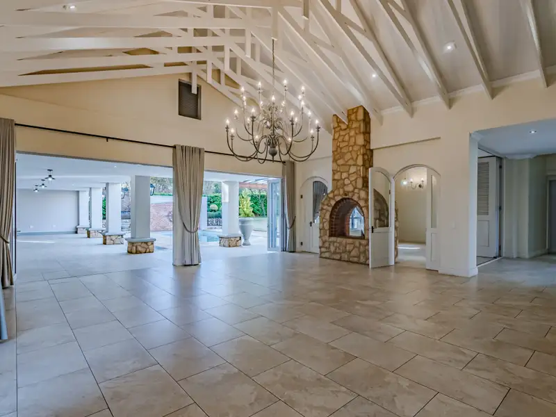 As you step into the welcoming entrance hall, the sophistication is immediately evident with marble floors leading the way to a formal lounge adorned with a cozy fireplace. the spacious open plan kitchen is a true chef's delight, complete with a separate laundry room and scullery. Designed for effortless flow, the kitchen opens seamlessly into a large living area with stacking doors that extend to a L-shaped entertainment patio, overlooking the sparkling pool and tranquil gardens.