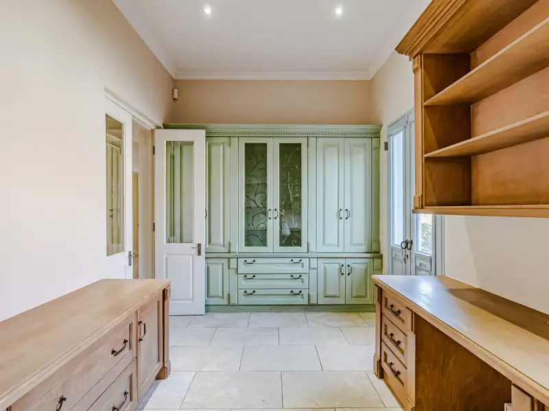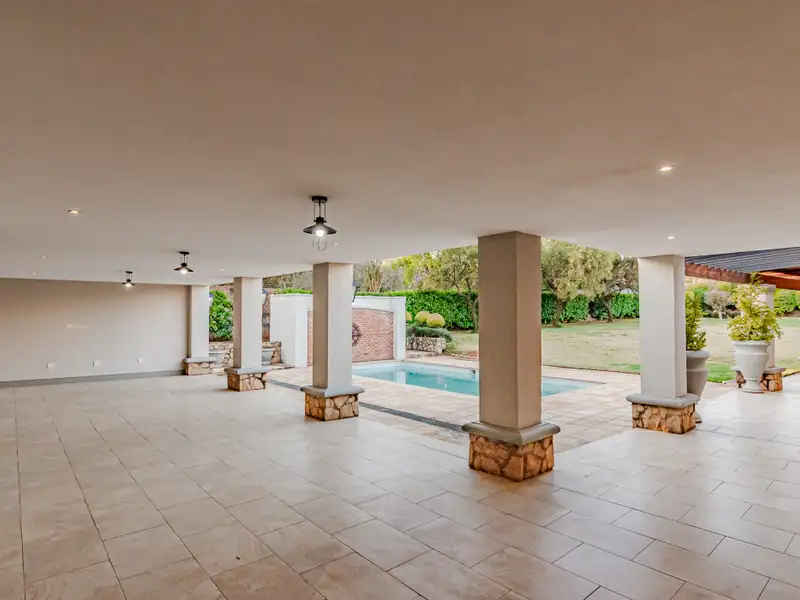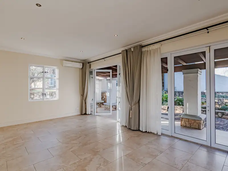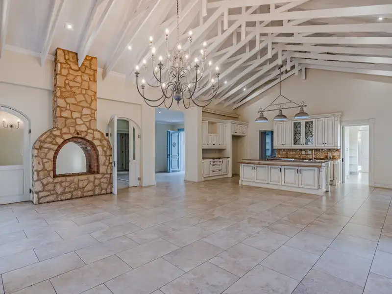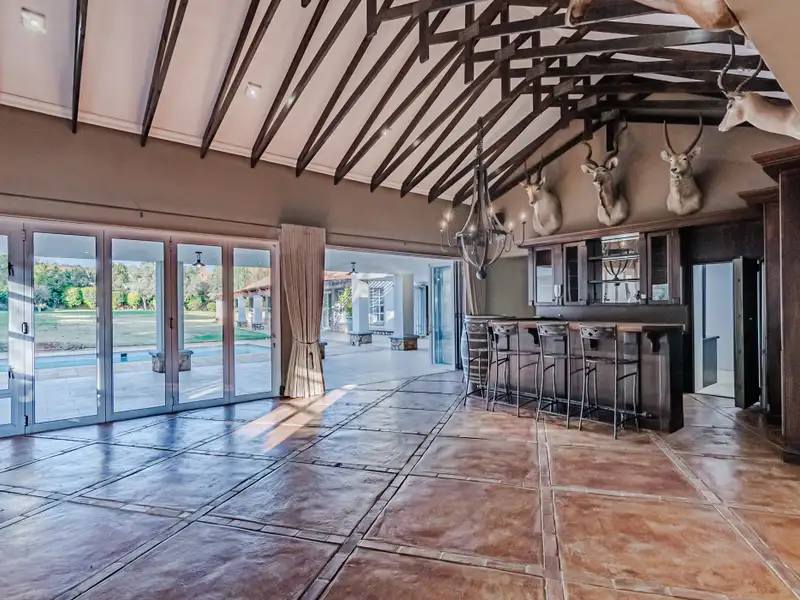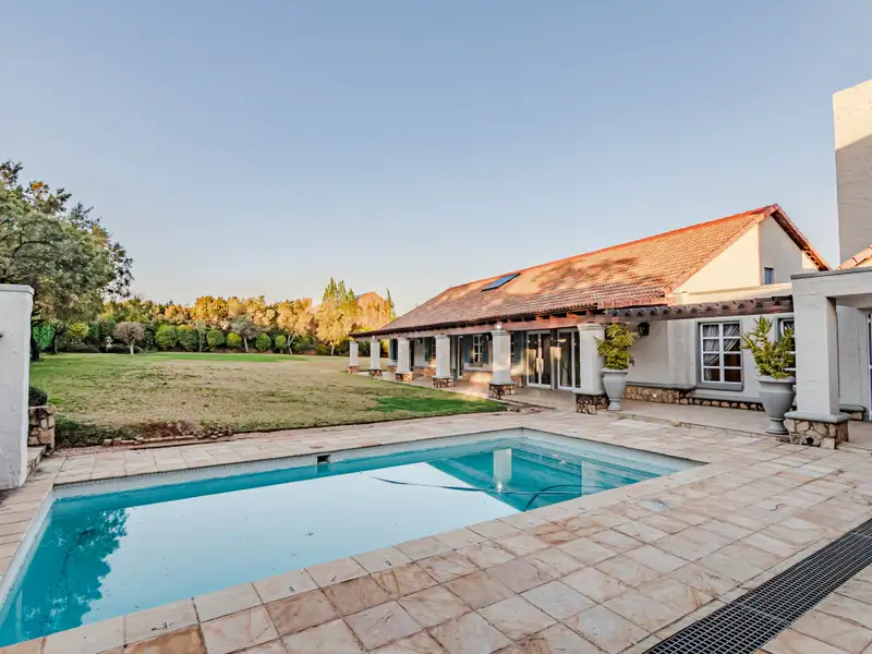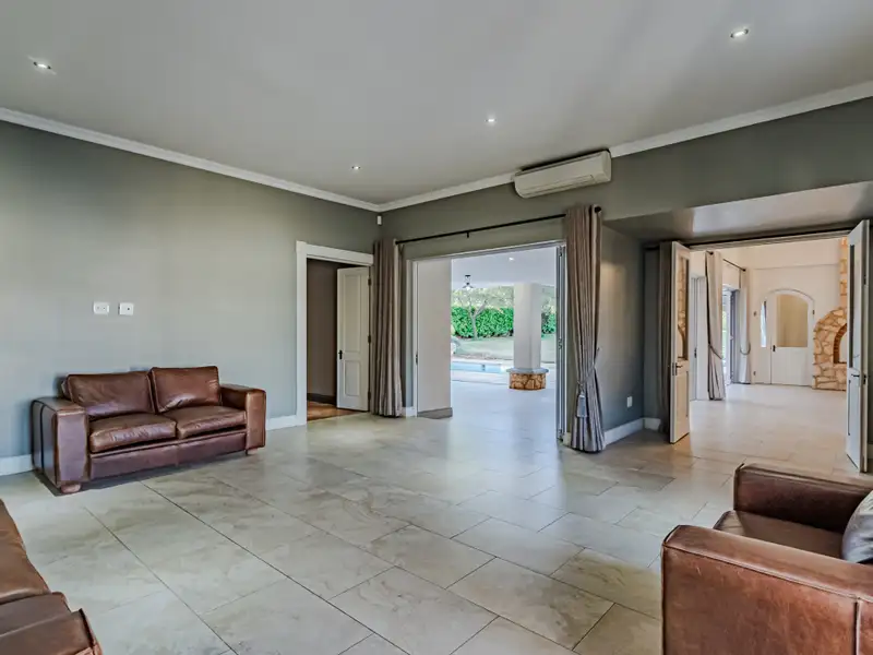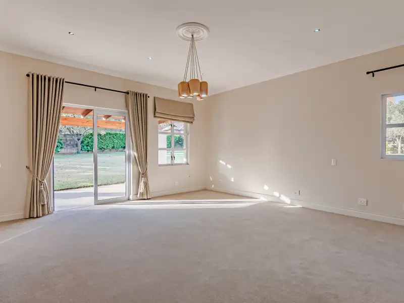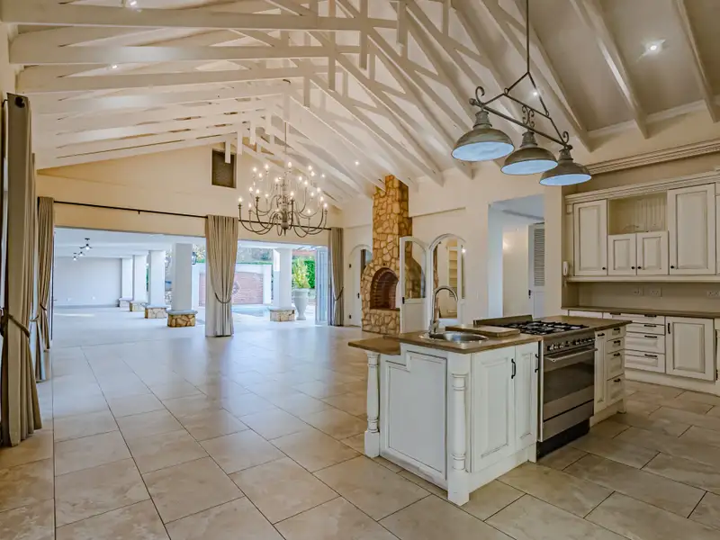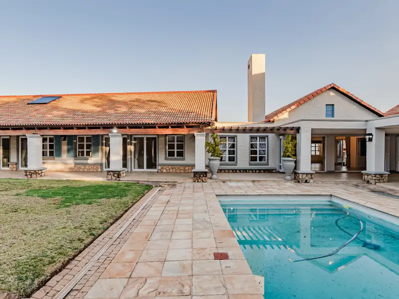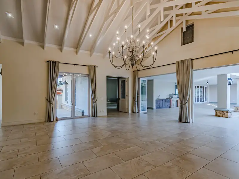 As you step into the welcoming entrance hall, the sophistication is immediately evident with marble floors leading the way to a formal lounge adorned with a cozy fireplace. the spacious open plan kitchen is a true chef's delight, complete with a separate laundry room and scullery. Designed for effortless flow, the kitchen opens seamlessly into a large living area with stacking doors that extend to a L-shaped entertainment patio, overlooking the sparkling pool and tranquil gardens.