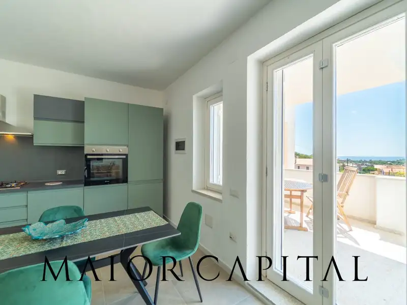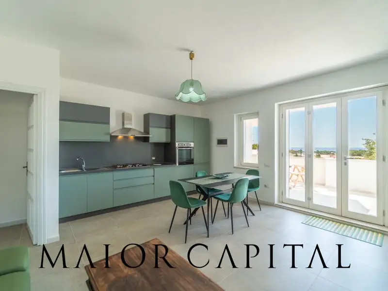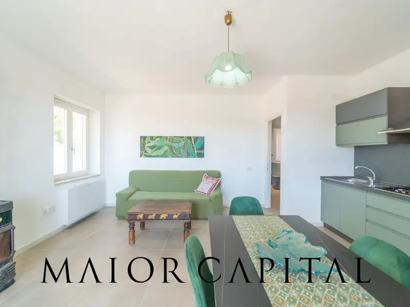 The ground floor welcomes guests with a spacious and bright living area, enhanced by large windows overlooking a covered veranda with sea view—perfect for outdoor breakfasts or sunset dinners. The open-plan kitchen, with refined sage green tones and matte finishes, harmoniously blends with the dining area, creating a modern, welcoming, and well-organized environment. The sleeping area includes a double bedroom and a windowed bathroom with contemporary finishes.