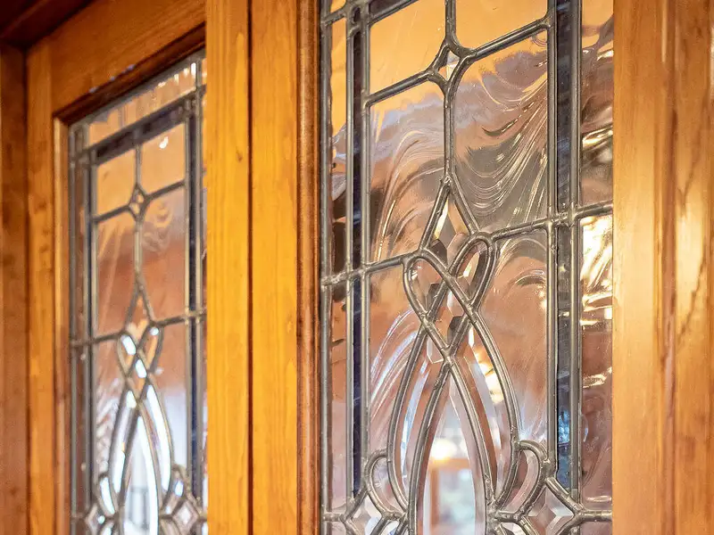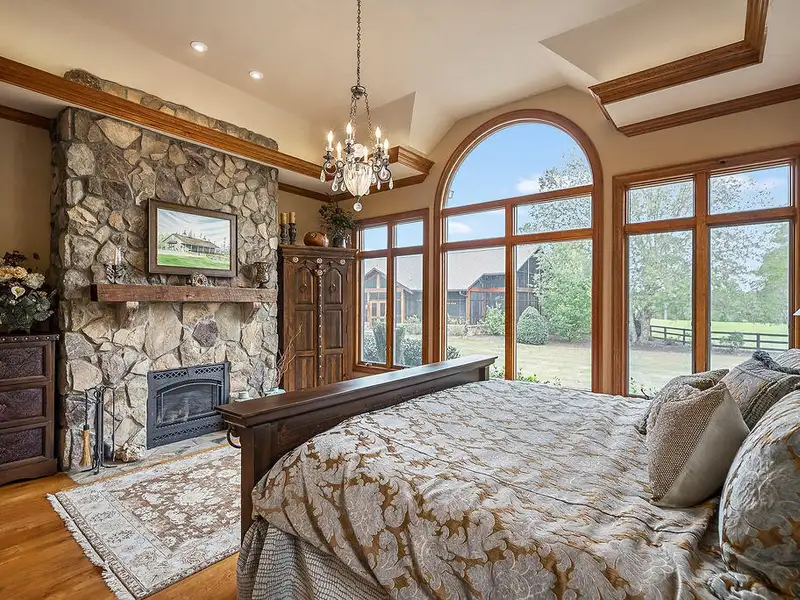 The multi-room primary retreat offers a spacious bedroom with a gas fireplace and Schoenbach crystal chandelier, dual room-size custom closets, and luxurious bath quarters featuring a sculptural jetted clawfoot tub, steam shower, heated floors, towel warmers, and stunning Savannah River Art-stained glass windows for a harmonious environ.