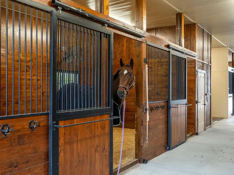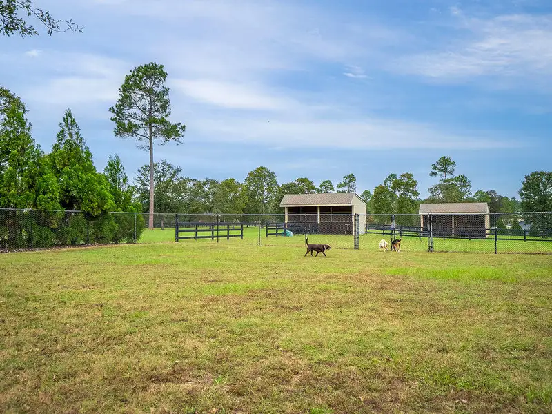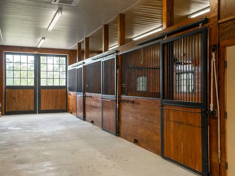 The 3500 sq.ft. climate-controlled barn has 4 stalls with Nelson automated-waterers & fans; wash-stall with heat lamps; storage and tack room, equipment/carriage storage area & laundry room with professional dog washing station. When you are away from home, your dogs will be comfortable in the kennel wing with kitchenette, half bath and 5 runs opening to a large, fenced yard. Your horses will love the turnout - 2 pastures and 2 paddocks - with 3 matted run-ins equipped with automatic waterers, fans & lights.