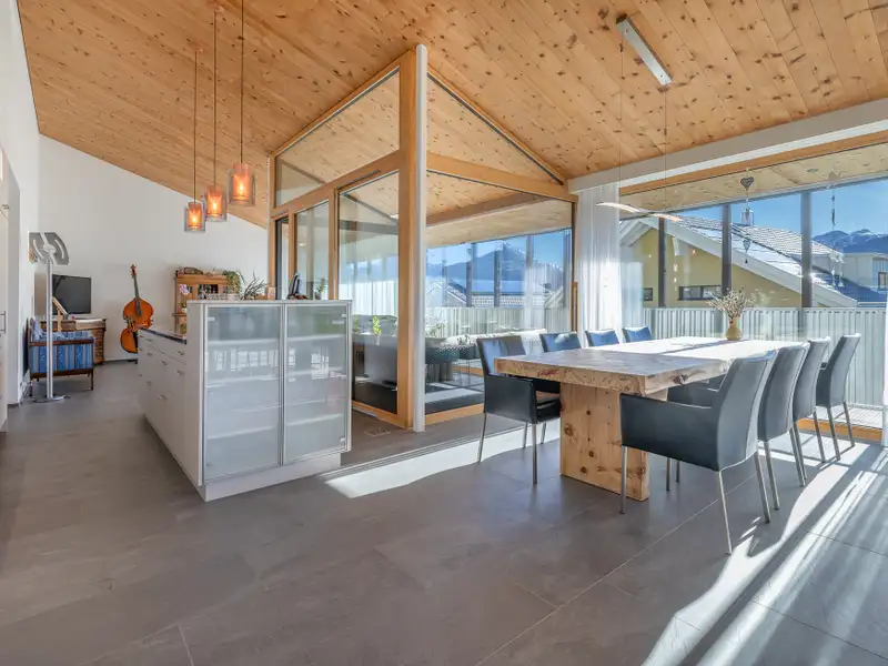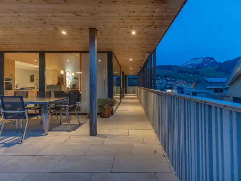 An sonniger Hanglage präsentiert sich dieses stilvolle Einfamilienhaus mit klarer Architektur, durchdachtem Raumkonzept und atemberaubender Weitsicht. Modernes Design trifft auf alpines Wohngefühl – ideal für Menschen, die Ruhe, Natur und stilvolles Wohnen gleichermassen schätzen. Im Erdgeschoss empfängt Sie das Haus mit überdachtem Hauszugang und geräumigem Entrée mit Garderobe. Zwei helle Zimmer und ein flexibler Nebenraum – ideal für Sport oder Wellness – fügen sich harmonisch an. Keller- und Technikräume sowie die geräumige Doppelgarage sorgen für Struktur und Ordnung und bieten viel Stauraum. Der offen gestaltete Wohnbereich im Obergeschoss bildet das Herzstück des Hauses. Raumhohe Fensterfronten verbinden Innen- und Aussenbereich und öffnen den Blick zur zentralen Loggia und der grosszügigen, überdachten Terrasse. Die moderne Küche mit angrenzendem Essbereich lädt zu gemeinsamen Koch- und Genusserlebnissen ein. Ein Master Bedroom mit Bad en Suite sowie ein weiteres Zimmer mit Gäste-Bad garantieren hohen Wohnkomfort und Privatsphäre. Klare Linien, hochwertige Materialien und lichtdurchflutete Räume prägen die moderne, warme Atmosphäre des Hauses. Der pflegeleichte Aussenbereich mit Garten und der freie Blick auf Natur und Bergpanorama machen dieses Haus zu einem Ort der Ruhe und Erholung. Ein einzigartiges Zuhause für Menschen, die ein stilvolles, durchdachtes und naturnahes Zuhause in Amden suchen.