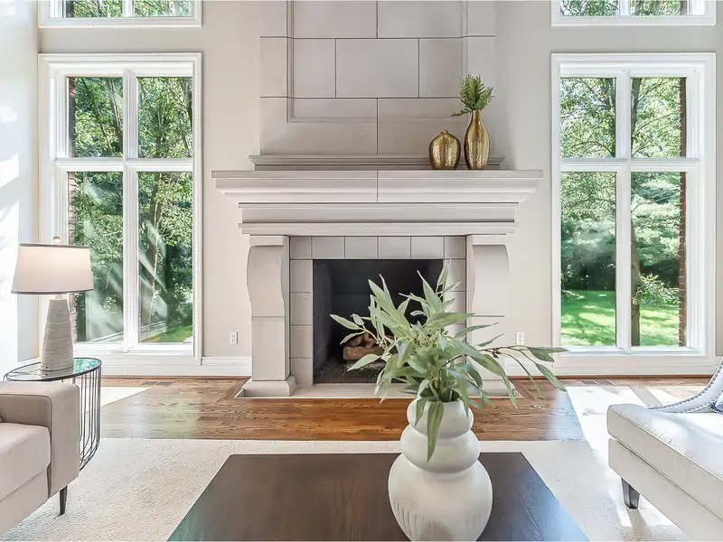 - 14-foot cut limestone fireplace centerpiece