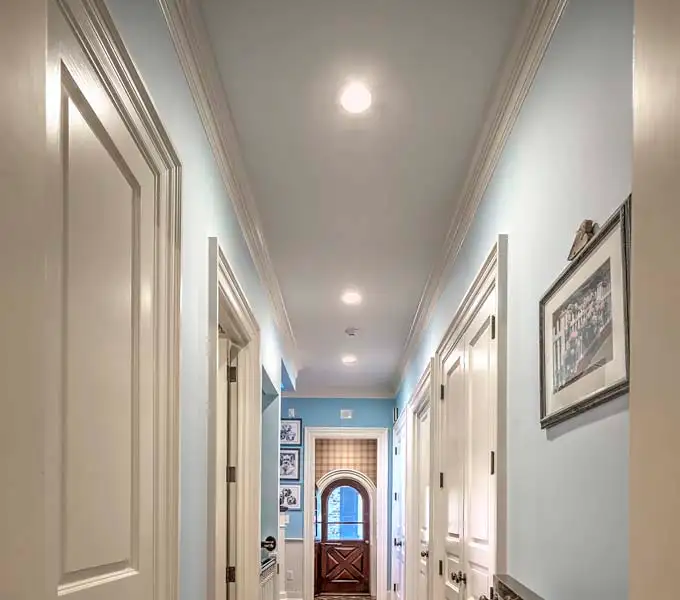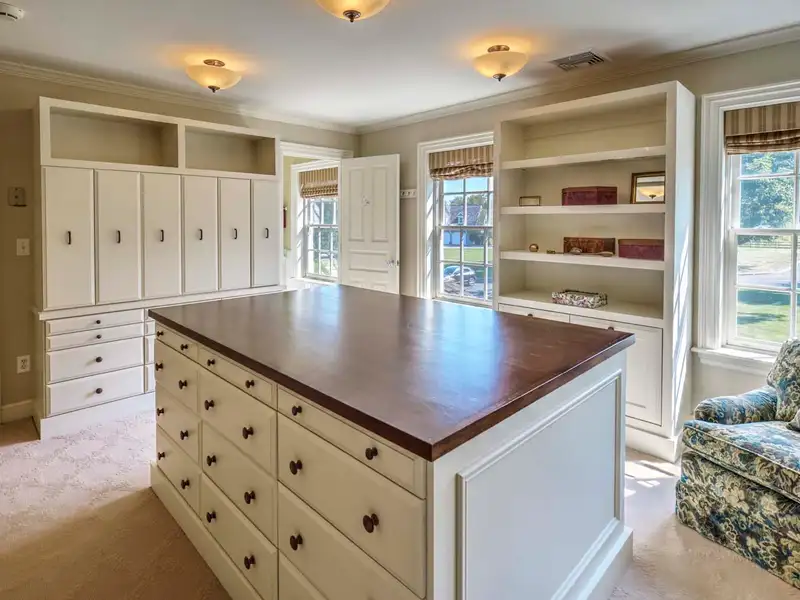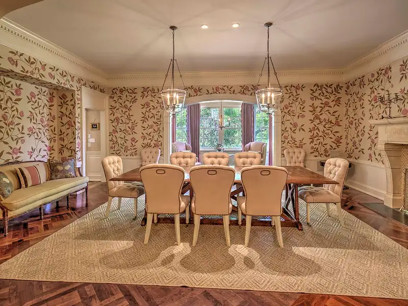 Classic design elements within the layout include seven intricately mantled fireplaces, oak wood floors, arched doorways, traditional moldings and woodwork, stunning architectural details, unique built-ins, custom-painted rooms, exposed ceiling beams, two wet bars, a rear staircase and covered porte-cochère access to the home's three-car garage. Hiland Hall Turner Architects oriented the residence on the acreage to take advantage of morning sunlight in the front rooms and colorful sunsets in rear-facing spaces.