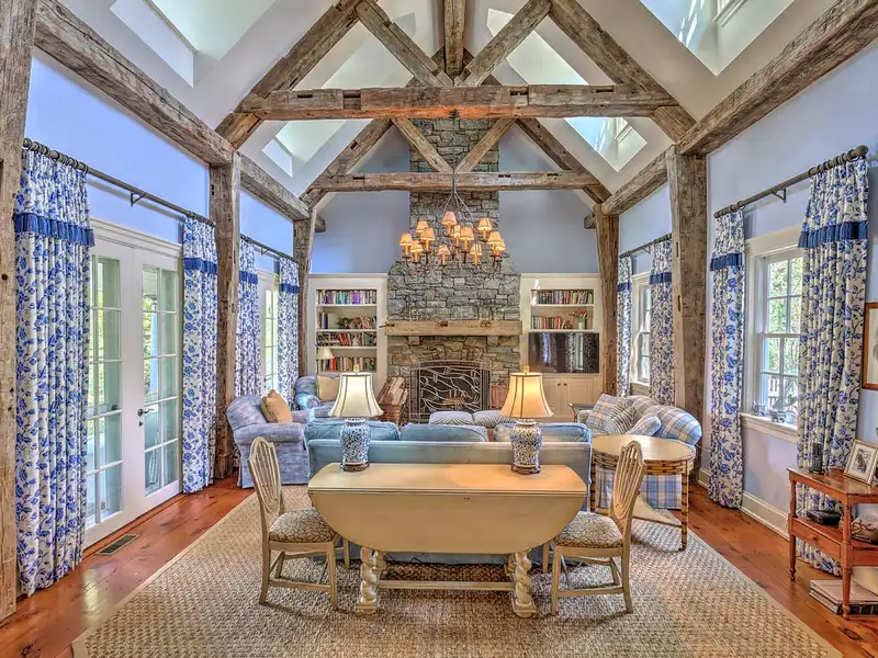The epicurean kitchen presents a center island with a prep sink, Franke farmhouse sink, custom cabinetry and a sun-splashed dining area with a domed ceiling featuring a hand-painted cloud mural. A collection of high-end appliances includes a Viking range, Sub-Zero refrigerator, Bosch dishwasher and wine refrigerator. Adjacent to the kitchen is a secondary office space and a butler's pantry. The floor plan continues into a great room set under towering vaulted ceilings accented by reclaimed wood beams. Natural light spills into this space from fixed upper windows and French doors to the porch, while a floor-to-ceiling stone fireplace is a handsome focal point. This part of the home is completed by a mudroom with storage options, informal powder room, staircase to the finished lower level, secondary stairs to the bedroom level, and access to the porte-cochère and garage.