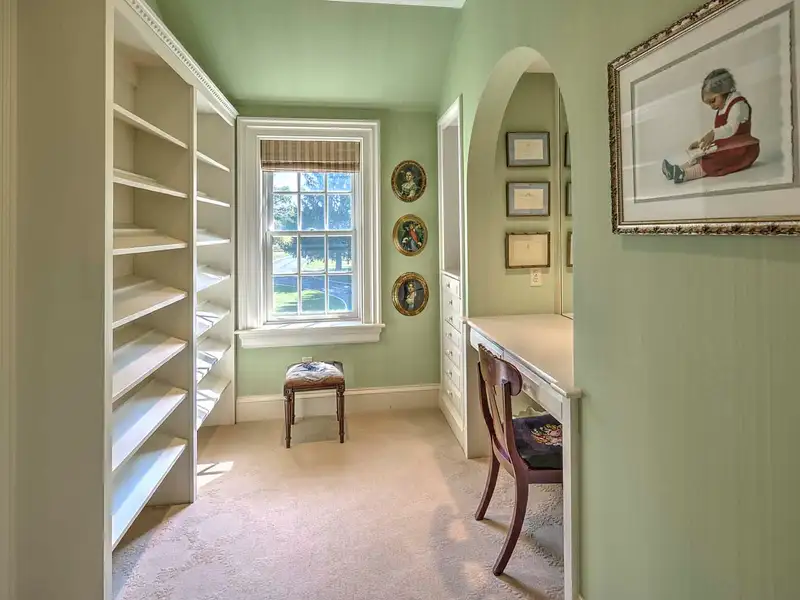Upstairs, a captivating window seat in the landing overlooks tranquil grounds. A primary suite begins in the vaulted ceiling bedroom featuring a fireplace, sitting area, built-ins and access to the extra-large primary balcony. An oversized dressing room with wardrobe organizers and two walk-in closets provide ample storage. The spa-like primary bath has a heated floor and includes a jetted soaking tub, separate water closet with a toilet and bidet, an oversized shower and double vanity. Four additional en suite bedrooms each connect to a full, private bath, and a laundry room is a smart addition. Over the garage, a finished guest area contains a kitchenette, large bedroom, full bath and amazing countryside views.