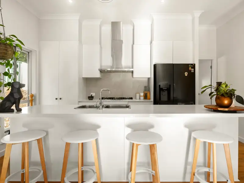 - Beautiful gas-fitted island kitchen with stone benchtops and a polished finish
