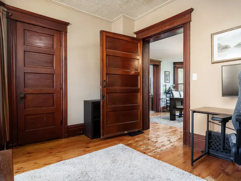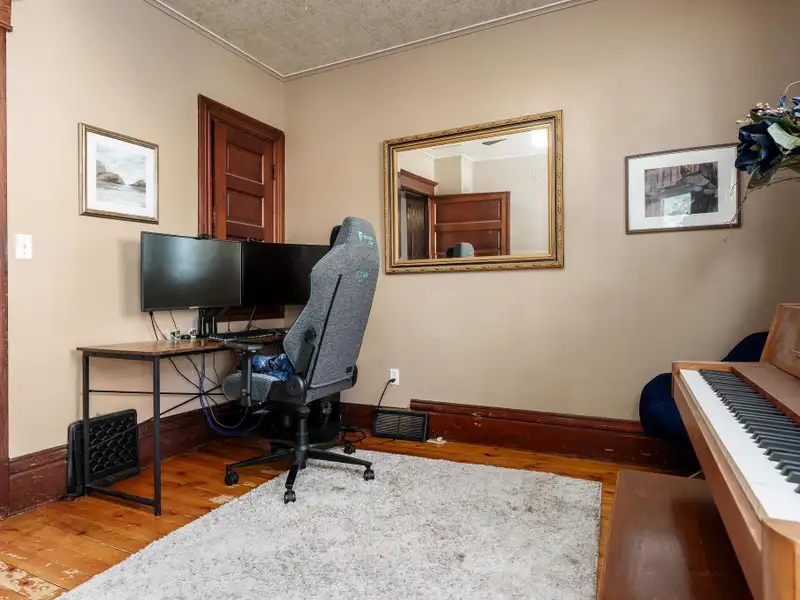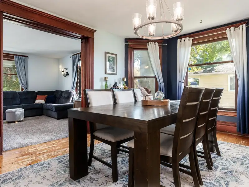 - Rustic hardwood floors in dining room