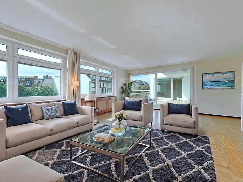 It has three rooms and impresses with its well thought-out room layout. The centerpiece is the open-plan living and dining area with access to the south-facing sun terrace - ideal for relaxing hours outdoors or social gatherings. Particularly noteworthy is the approx. 40 m² living room, which impresses with its brightness and far-reaching views.