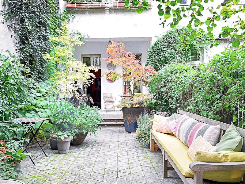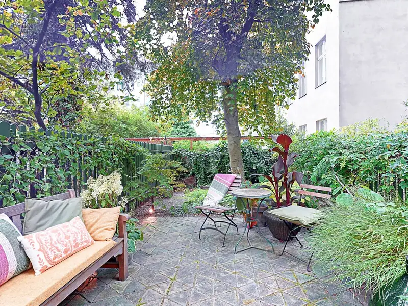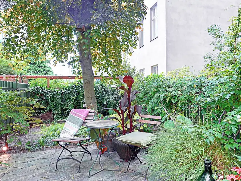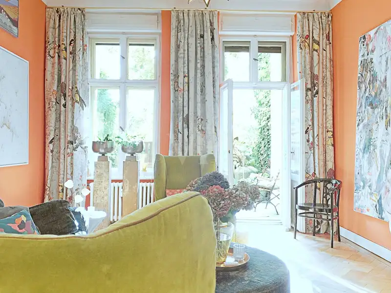 The heart of the apartment is the spacious living and dining area, which is given its special character by the original parquet and floorboards. Generous windows flood the room with light and provide a calming view of the large romantic garden, which is exclusively available to this apartment.