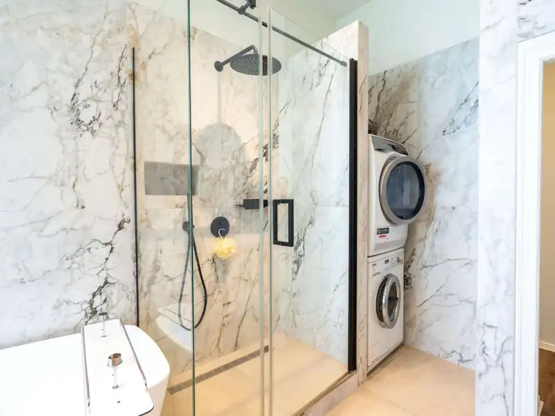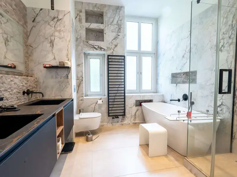 Zwei moderne Bäder sorgen für hohen Alltagskomfort. Das größere Bad überzeugt mit großer Badewanne, Dusche und Doppelwaschtisch – eine kleine Wellness-Oase. Das zweite Bad ist als Gäste-WC mit Dusche gestaltet und fügt sich harmonisch in das Gesamtbild der Wohnung ein.