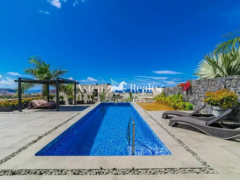 The ground floor of 126 m2 features a welcoming entrance hall, spacious living-dining room, modern kitchen, a double bedroom, and a full bathroom. This floor opens to a spectacular outdoor area with a terrace, garden, and a 27 m2 pool, all totaling 377 m2, offering panoramic views of the sea and the island of La Gomera.