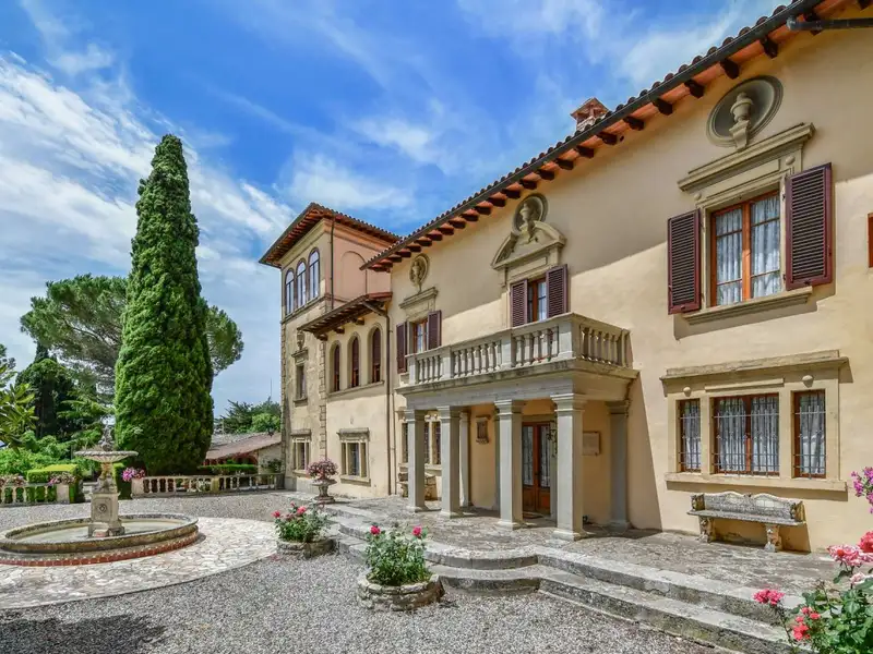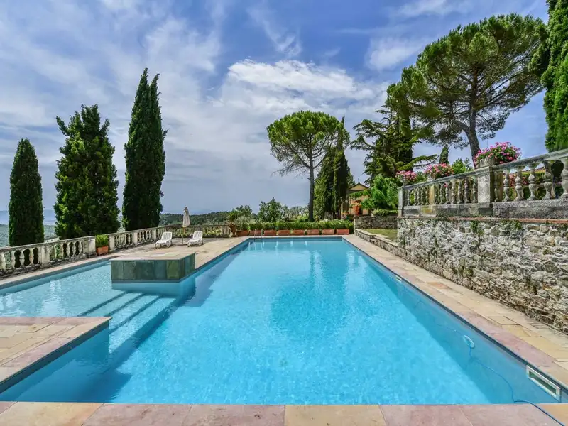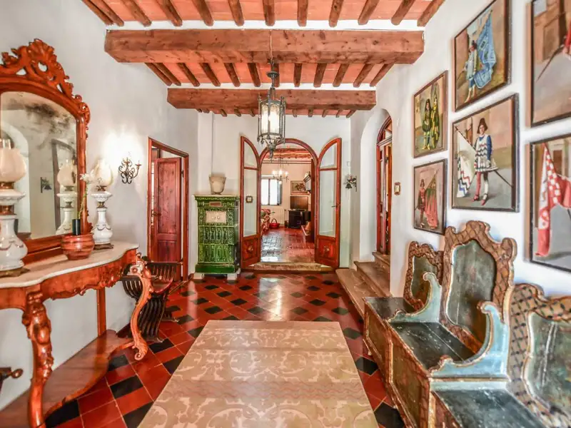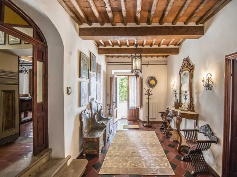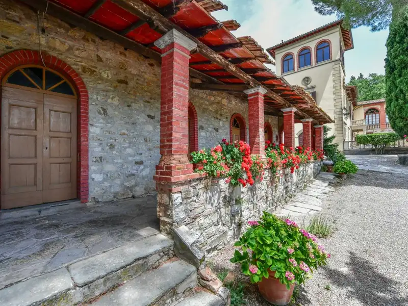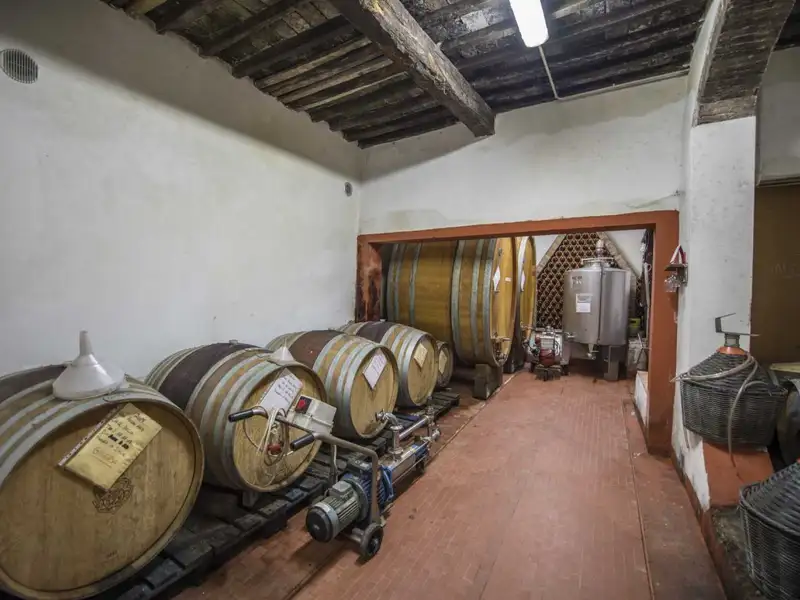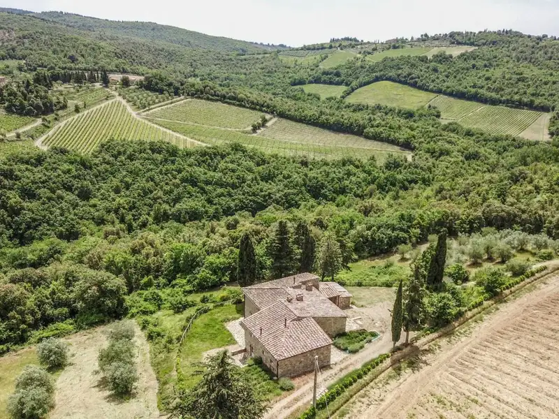 In the heart of Chianti Classico, in a panoramic position not far from Castellina, this 158.5-ha estate hosts several buildings (4,431 sqm) among which a manor villa, a wine cellar and farmhouses currently used for guests Agriturismo. The vineyards (19.4 ha) allow producing up to 110,000 bottles of Chianti Classico DOCG and Reserve wine, while the olive grove (21.2 ha) can produce up to 5,000 kg of oil. The estate is easily reached via the municipal road network and is located right in the heart of Tuscany, a feature which greatly enhances its appeal as an accommodation business, allowing easily moving throughout Tuscany and easily connected to airports. Villa Iolanda (935sqm –8 beds - 8 baths) is a building in late-baroque style and dates back to the 18th century. The restoration was carried out between 2003-04. The building houses 3 halls, one of which with independent access, 2 dining rooms, a studio, 8 double bedrooms with private bathroom. The villa is embellished by a finely landscaped garden which hosts the panoramic swimming pool. The manorial complex is completed by a warehouse, a tavern with oven and a consecrated chapel ideal to celebrate weddings. Naccolino (837sqm –12 beds and 12 baths) is a 14th-century building split into 5 apartments with independent access and can host up to 25 pers. Outside, a swimming pool is reserved for the guests of the structure. Casa al Bosco (258 sqm -7 beds-6 baths) is a 14th-century building split into 4 apartments which could host up to 14 pers. The farmhouse is located amidst the wood, in a quiet and retired location. The hamlet Naccolone (1,692sqm) is the real heart of the estate and is made up of buildings dating back to the 14th century assembled around a small square with a fountain. These buildings house the offices, the salesroom, the wine cellar (671sqm) and the olive mill (162sqm). Other rooms can be used by the staff. We have the 14th-century Podere Gaversa (356 sqm 4 beds - 2 baths), not yet restored but split into 2 apartments: Lastly, the building Capraie (353 sqm) houses ample storage rooms and a garage. The buildings in the property, except for the manor villa, are Typical Tuscan farmhouse with stone and masonry walls. Inside, all the typical features of countryside buildings have been preserved and we can find terracotta floors, wooden beams and stone fireplaces. The villa is a beautiful 18th-century building with original finishes which include ample halls with huge windows allowing a great deal of light to enter the building. The estate covers a total surface of 158.5 hectares. Backbone of the estate are the Chianti Classico DOCG vineyards (19.4 ha) and the olive grove (21.2 ha). The remaining surface is split among fruit orchard (0.3 ha), mixed woodland (105 ha), arable and unused land (12.6 ha). Buildings are surrounded by gardens and pertinences for a total of approximately 13,700 sqm.