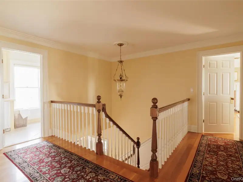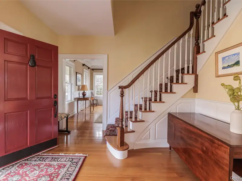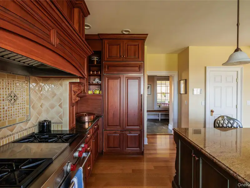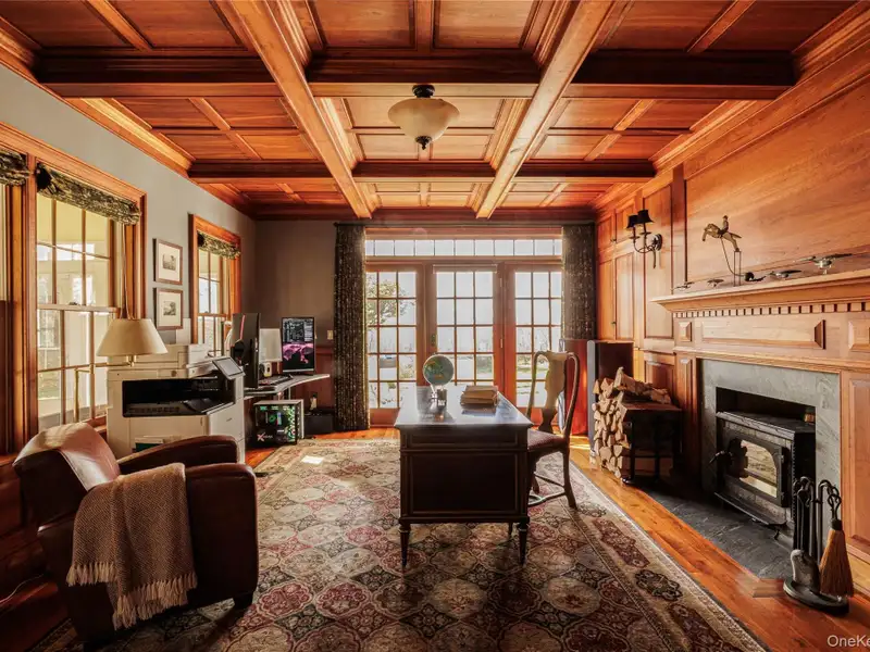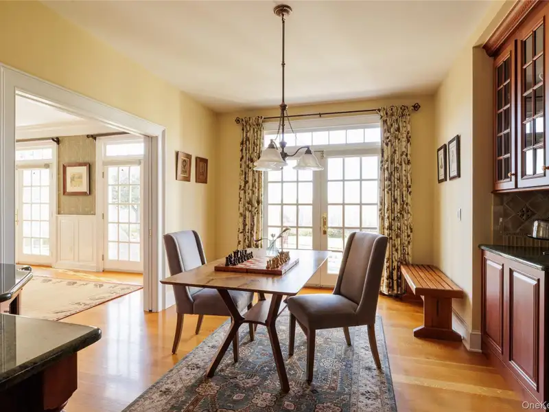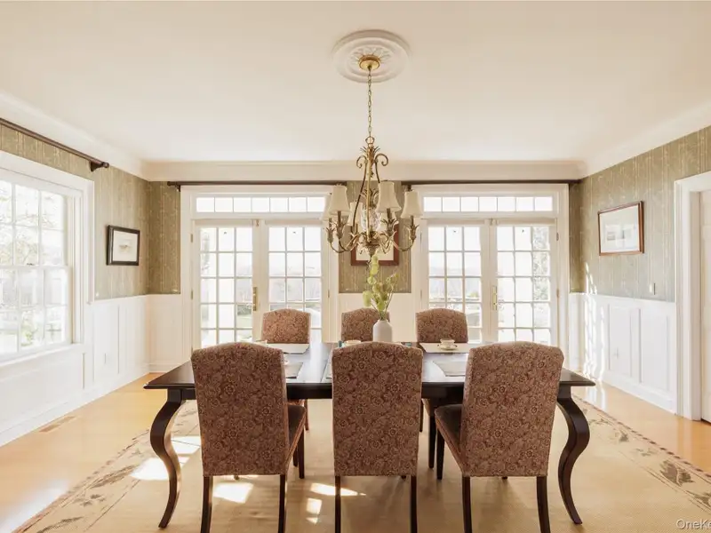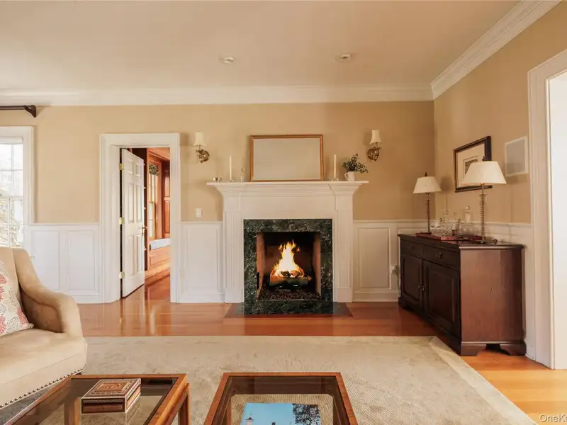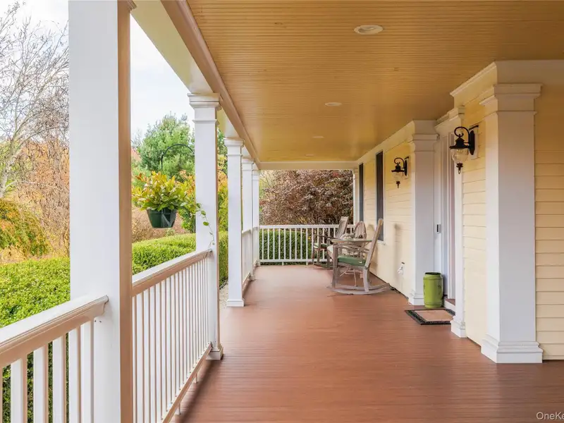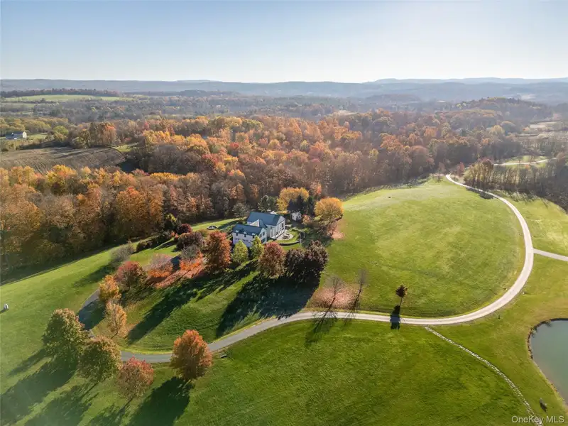 Welcome to Notre Colline Estate, a private country compound set on more than 56 acres of rolling meadows, gardens, ponds, and Catskill Mountain views. French for Our Hill, Notre Colline has an easy sense of belonging to its landscape. A long paved drive leads to this elegantly designed 5,760-square-foot home, inspired by classic Greek Revival architecture. Built in 2005 for comfort, entertaining, and longevity, it features a standing-seam metal roof, radiant heated floors, energy-efficient heat pumps, and a fully integrated smart home system that manages lighting, temperature, security, video, and sound.The main level opens to bright, connected gathering spaces centered around a modern chefs kitchen with a large custom island, a counter depth panelized fridge, and professional-grade appliances. French doors from the dining area and breakfast nook open to a wide stone patio with an outdoor kitchen framed by landscaped gardens and open lawns, creating an easy indoor-outdoor flow. A paneled cherry wood office with built-in cabinetry and a wood-burning stove offers a quiet workspace beside a three-season sunroom, and a spacious living room with a gas fireplace invites relaxed evenings with friends and family.Upstairs, the grand primary suite feels like a private retreat, complete with a gas fireplace, two walk-in closets, and a luxurious bath with soaking tub and steam shower. Three additional bedrooms, a guest living room, two full bathrooms, and a laundry room complete the second floor. The finished lower level adds generous additional living space with a recreation room, billiards area, kitchenette, sauna, and full bath, ideal for guests or wellness use. An attached three-car heated garage features a porcelain tile floor and plenty of space for storage.Outdoors, a peaceful aerated pond lies at the center of the property, crossed by a charming footbridge and bordered by open lawns and walking paths. The grounds also include fenced in raised-bed gardens with irrigation, a potting shed, and a newly constructed insulated 26x34 foot outbuilding with water, electric, and space for six or more vehicles. Every detail has been considered for efficiency and ease, from spray-foam insulation and upgraded hydronic systems to improved drainage and a generator. Located minutes from Chatham village, Notre Colline Estate offers refined country living in beautiful Columbia County.