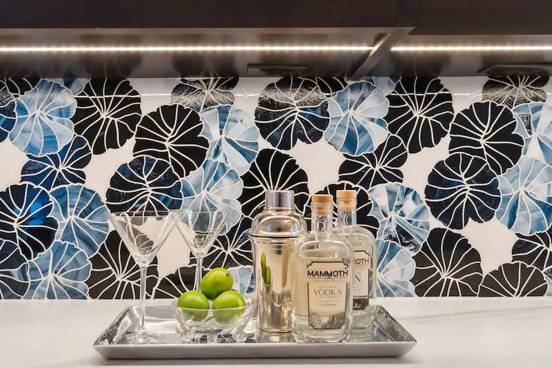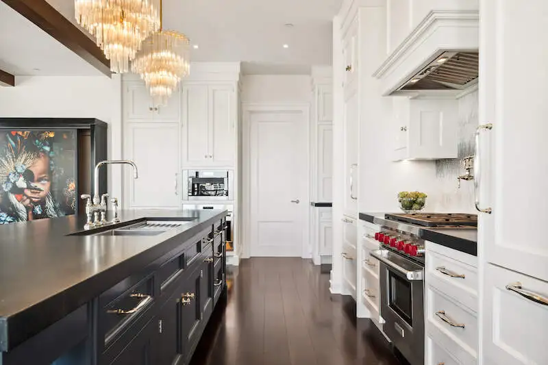 - Kitchen with custom cabinetry and marble counters